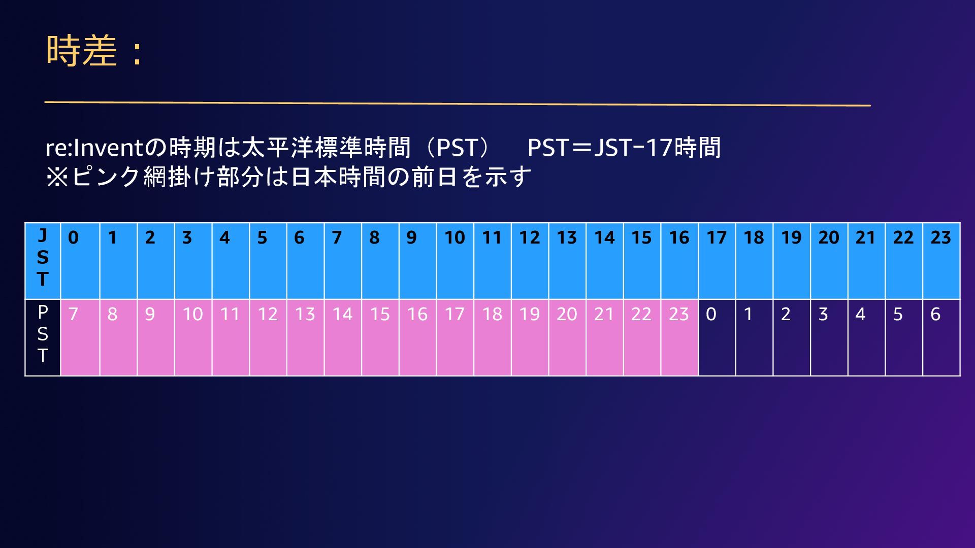 時差: re:Inventの時期は太平洋標準時間(PST) PST=JSTー17時間 ※ピンク網掛け部分は日本時間の前日を示す J S T 0 1 2