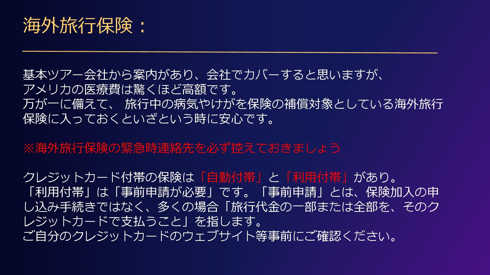 海外旅行保険: 基本ツアー会社から案内があり、会社でカバーすると思いますが、 アメリカの医療費は驚くほど高額です。 万が一に備えて、 旅行中の病気やけがを保険の補償対象としている海外旅行 保険に入っておくといざという時に安心です。 ※海外旅行保険の緊急時連絡先を必ず控えておきましょう クレジットカード付帯の保険は「自動付帯」と「利用付帯」があり。 「利用付帯」は「事前申請が必要」です。「事前申請」とは、保険加入の申 し込み手続きではなく、多くの場合「旅行代金の一部または全部を、そのク