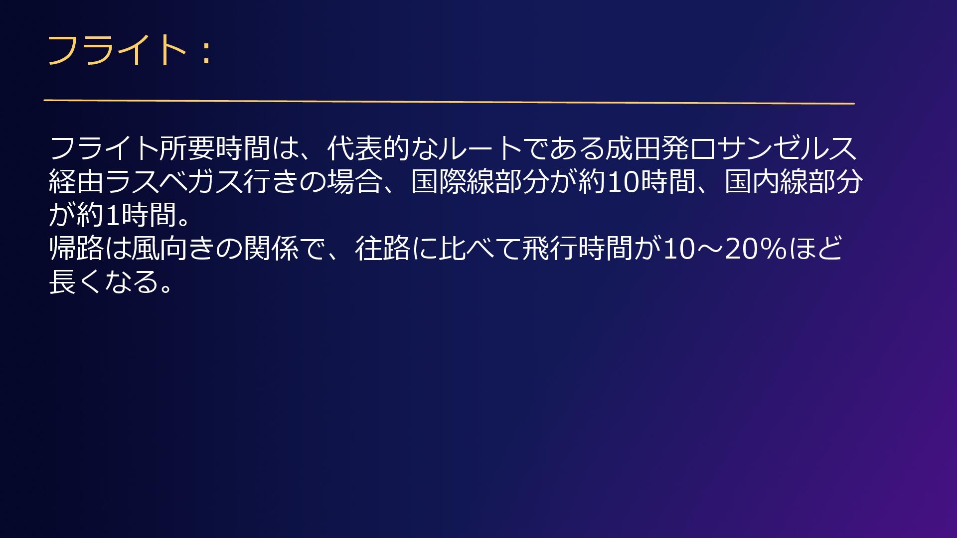 フライト: フライト所要時間は、代表的なルートである成田発ロサンゼルス 経由ラスベガス行きの場合、国際線部分が約10時間、国内線部分 が約1時間。 帰路は風向きの関係で、往路に比べて飛行時間が10〜20%ほど 長くなる。