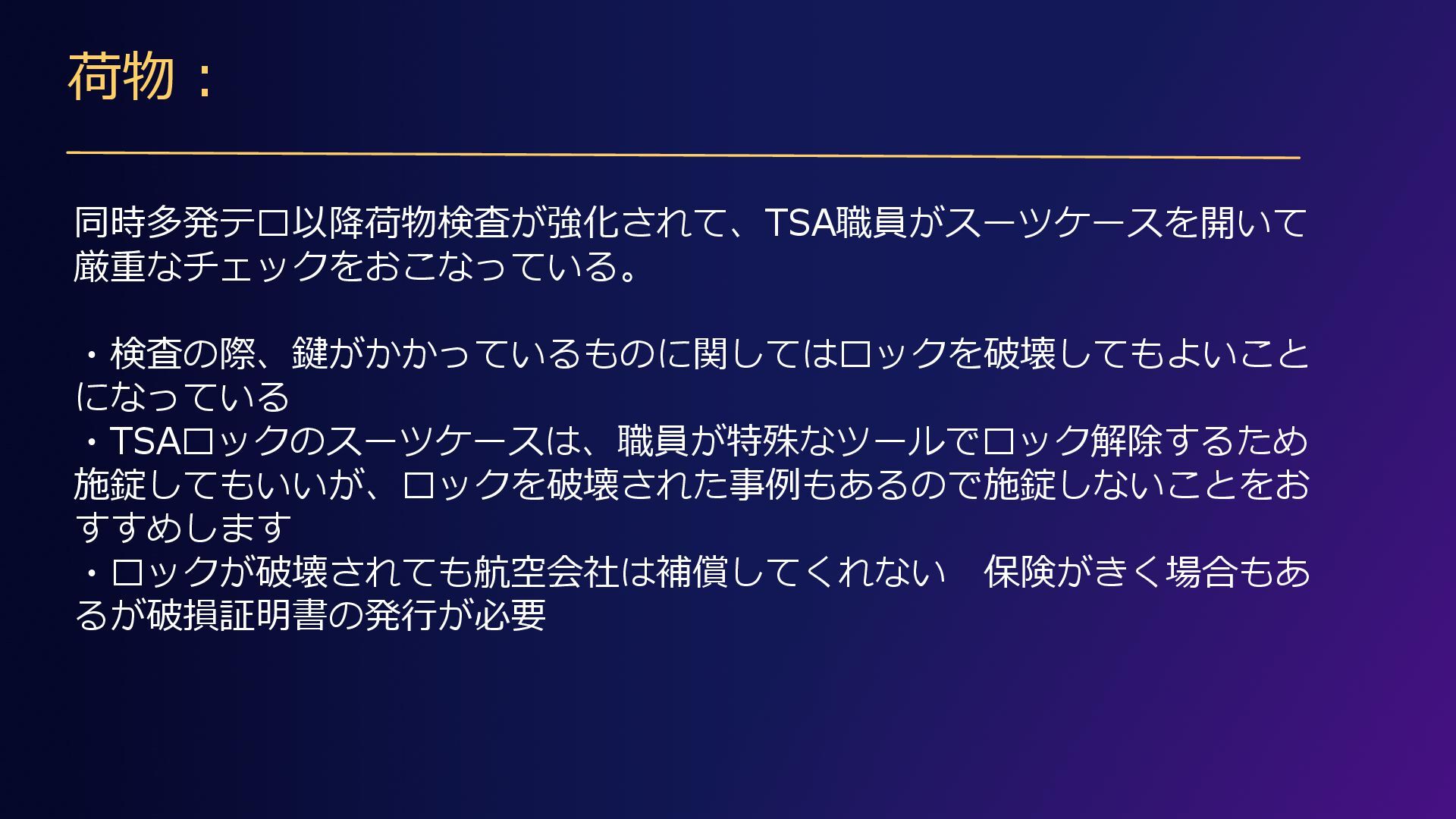 荷物: 同時多発テロ以降荷物検査が強化されて、TSA職員がスーツケースを開いて 厳重なチェックをおこなっている。 ・検査の際、鍵がかかっているものに関してはロックを破壊してもよいこと になっている ・TSAロックのスーツケースは、職員が特殊なツールでロック解除するため 施錠してもいいが、ロックを破壊された事例もあるので施錠しないことをお すすめします ・ロックが破壊されても航空会社は補償してくれない 保険がきく場合もあ