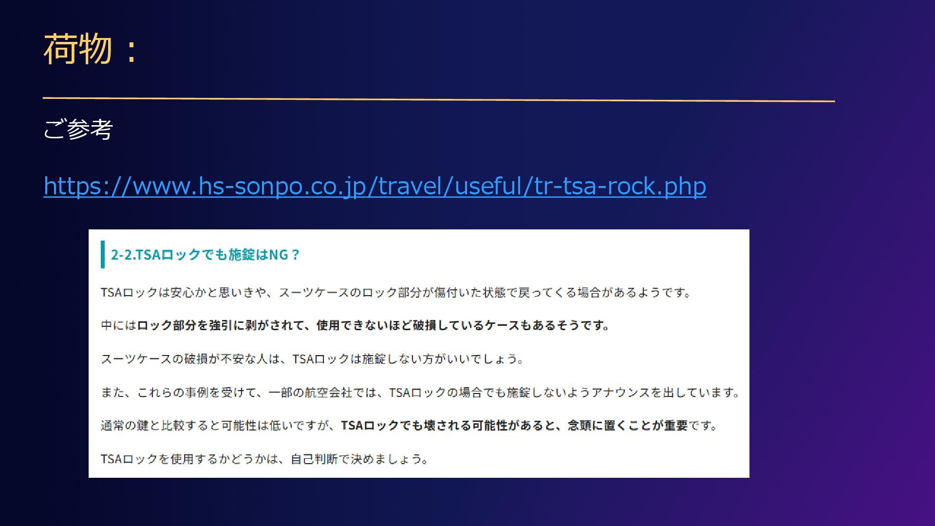 荷物: ご参考 https://www.hs-sonpo.co.jp/travel/useful/tr-tsa-rock.php