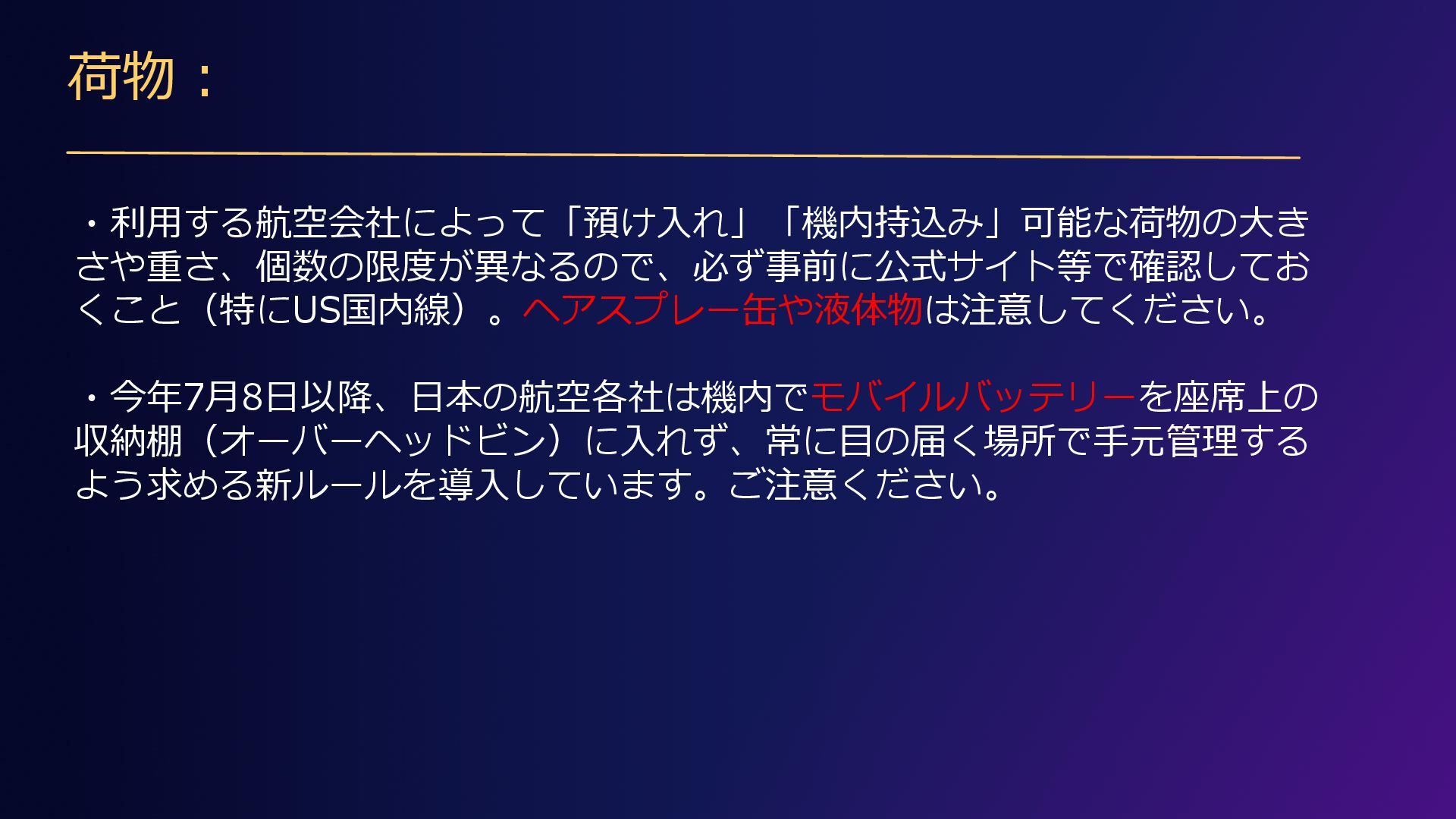 荷物: ・利用する航空会社によって「預け入れ」「機内持込み」可能な荷物の大き さや重さ、個数の限度が異なるので、必ず事前に公式サイト等で確認してお くこと(特にUS国内線)。ヘアスプレー缶や液体物は注意してください。 ・今年7月8日以降、日本の航空各社は機内でモバイルバッテリーを座席上の 収納棚(オーバーヘッドビン)に入れず、常に目の届く場所で手元管理する よう求める新ルールを導入しています。ご注意ください。