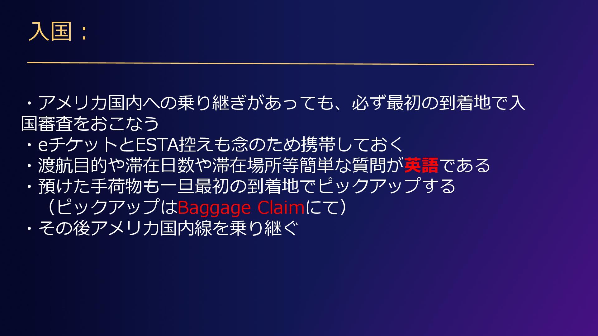 入国: ・アメリカ国内への乗り継ぎがあっても、必ず最初の到着地で入 国審査をおこなう ・eチケットとESTA控えも念のため携帯しておく ・渡航目的や滞在日数や滞在場所等簡単な質問が英語である ・預けた手荷物も一旦最初の到着地でピックアップする (ピックアップはBaggage Claimにて) ・その後アメリカ国内線を乗り継ぐ