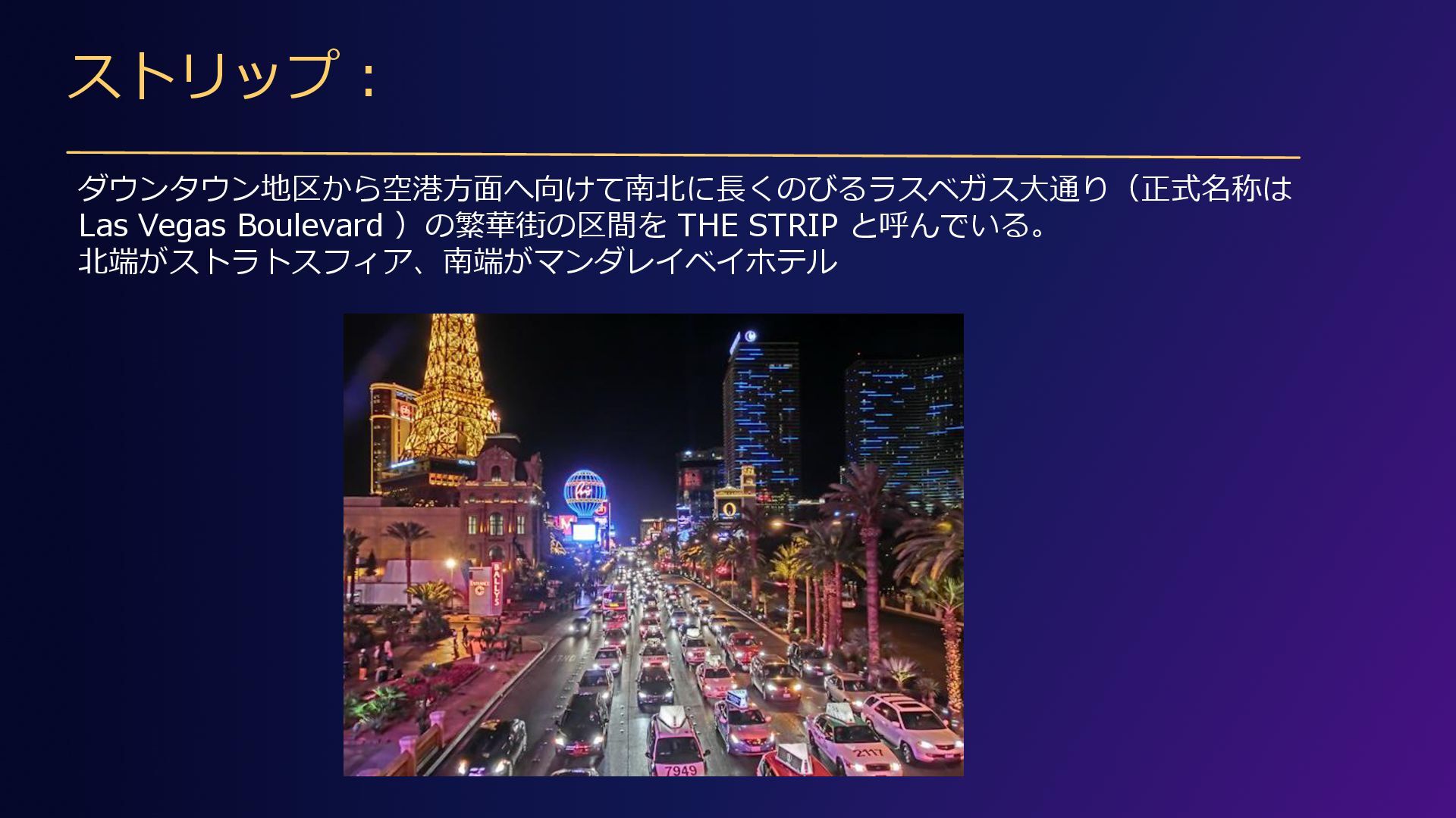 ストリップ: ダウンタウン地区から空港方面へ向けて南北に長くのびるラスベガス大通り(正式名称は Las Vegas Boulevard )の繁華街の区間を THE STRIP と呼んでいる。 北端がストラトスフィア、南端がマンダレイベイホテル