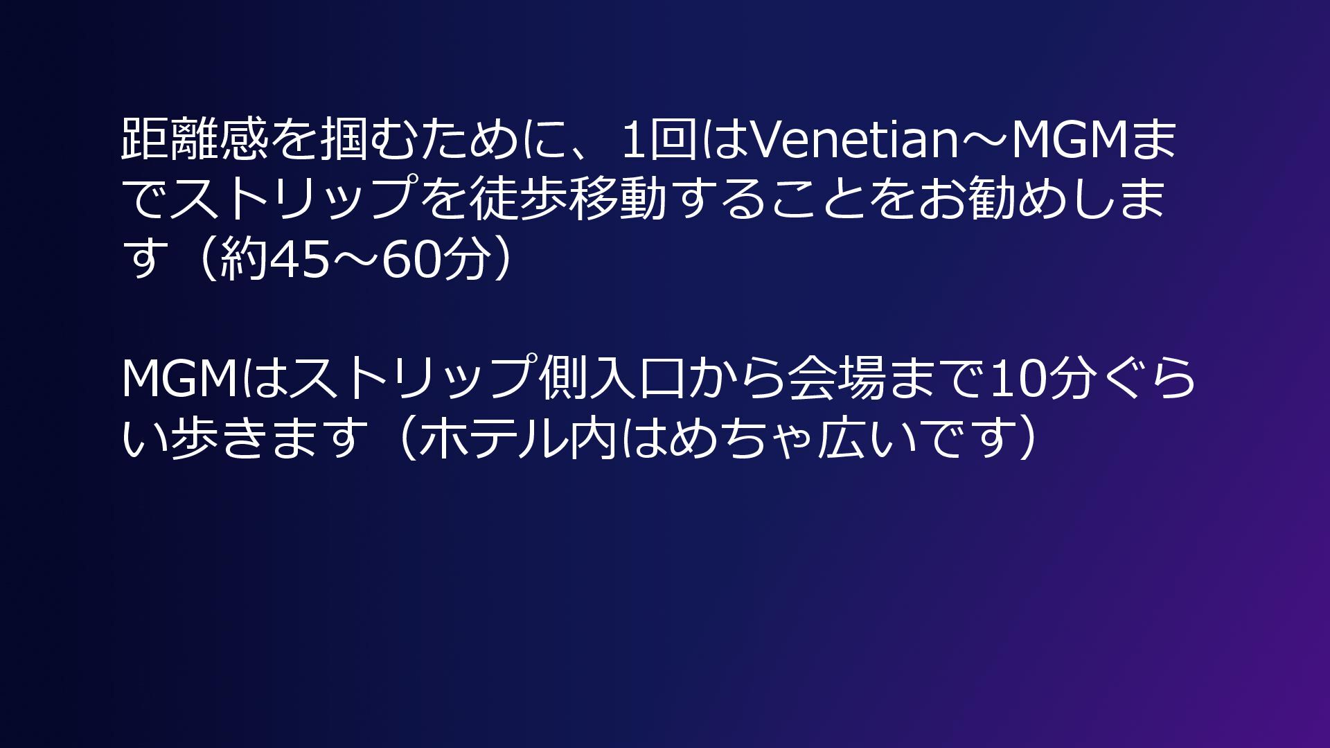 距離感を掴むために、1回はVenetian〜MGMま でストリップを徒歩移動することをお勧めしま す(約45〜60分) MGMはストリップ側入口から会場まで10分ぐら い歩きます(ホテル内はめちゃ広いです)