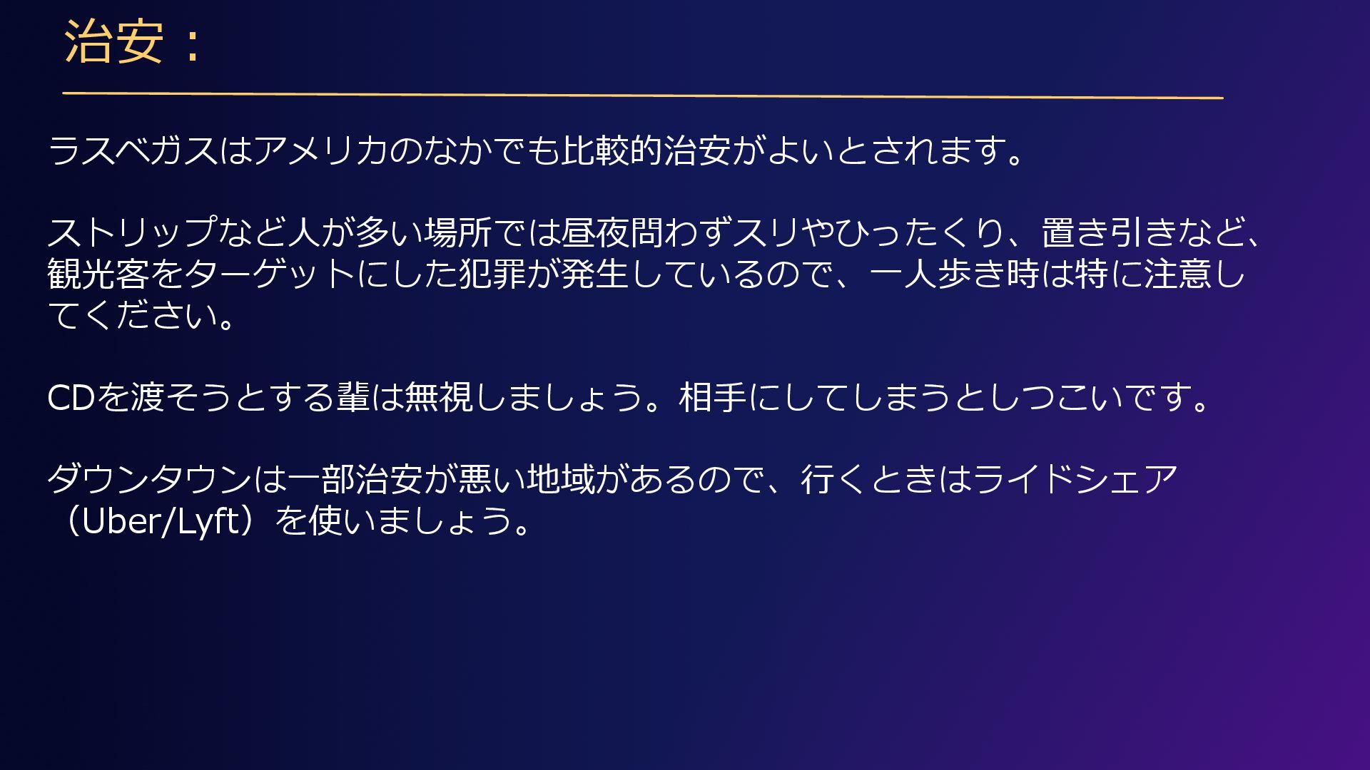 治安: ラスベガスはアメリカのなかでも比較的治安がよいとされます。 ストリップなど人が多い場所では昼夜問わずスリやひったくり、置き引きなど、 観光客をターゲットにした犯罪が発生しているので、一人歩き時は特に注意し てください。 CDを渡そうとする輩は無視しましょう。相手にしてしまうとしつこいです。 ダウンタウンは一部治安が悪い地域があるので、行くときはライドシェア (Uber/Lyft)を使いましょう。