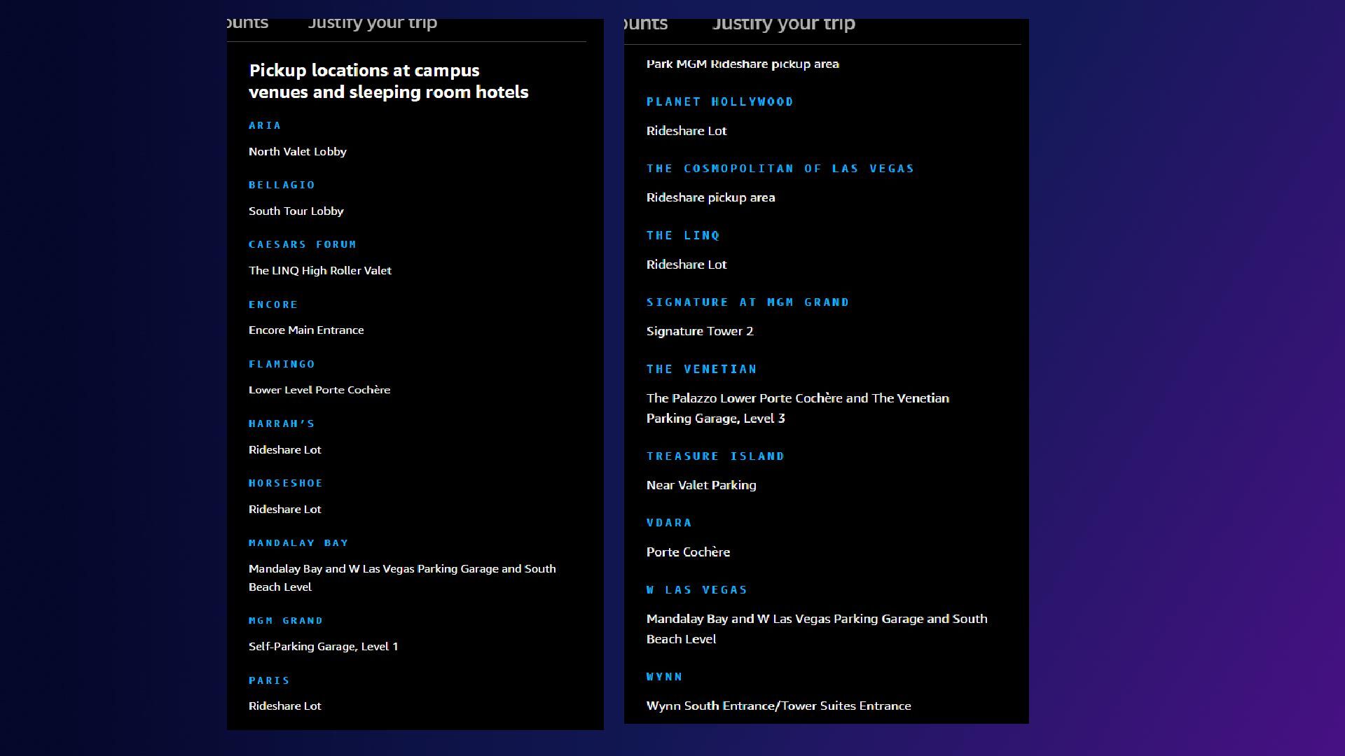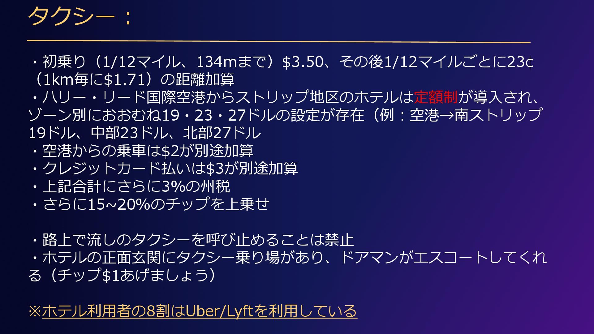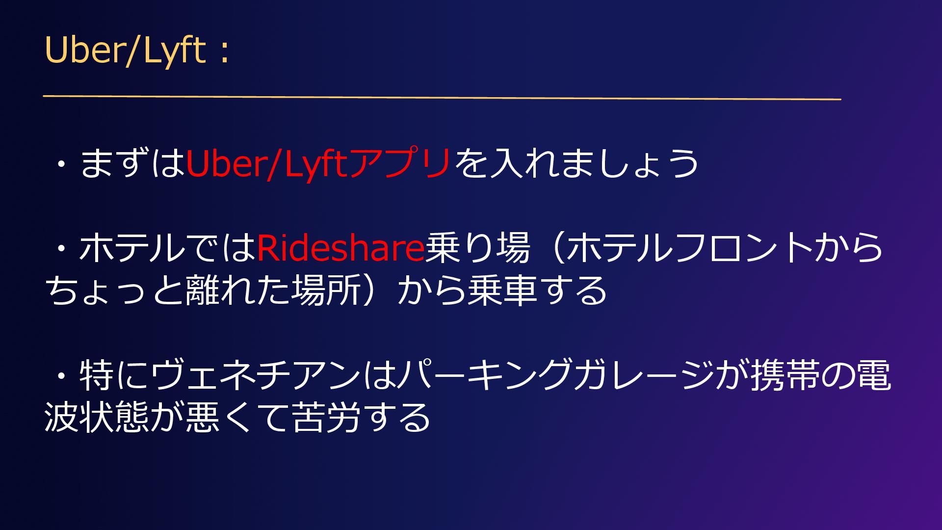 Uber/Lyft: ・まずはUber/Lyftアプリを入れましょう ・ホテルではRideshare乗り場(ホテルフロントから ちょっと離れた場所)から乗車する ・特にヴェネチアンはパーキングガレージが携帯の電 波状態が悪くて苦労する