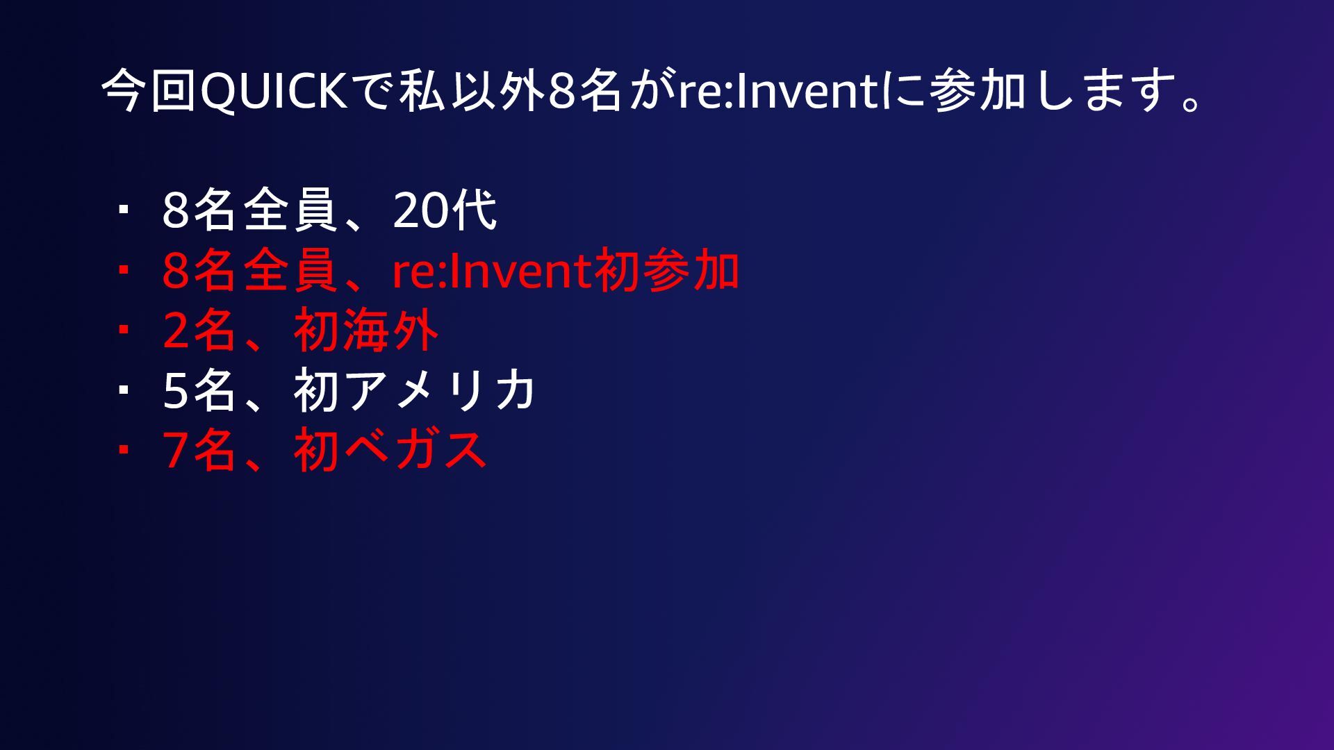 今回QUICKで私以外8名がre:Inventに参加します。 ・ 8名全員、20代 ・ 8名全員、re:Invent初参加 ・ 2名、初海外 ・ 5名、初アメリカ ・