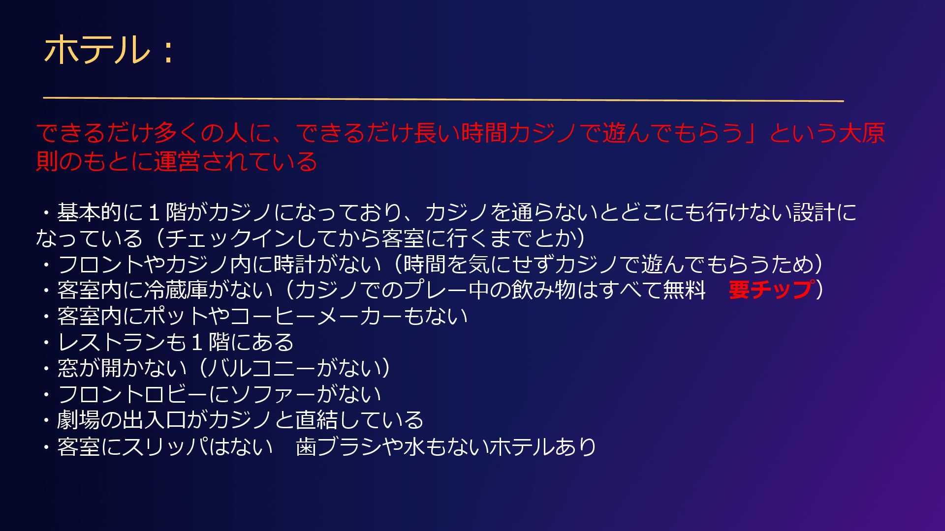 ホテル: できるだけ多くの人に、できるだけ長い時間カジノで遊んでもらう」という大原 則のもとに運営されている ・基本的に1階がカジノになっており、カジノを通らないとどこにも行けない設計に なっている(チェックインしてから客室に行くまでとか) ・フロントやカジノ内に時計がない(時間を気にせずカジノで遊んでもらうため) ・客室内に冷蔵庫がない(カジノでのプレー中の飲み物はすべて無料 要チップ) ・客室内にポットやコーヒーメーカーもない ・レストランも1階にある