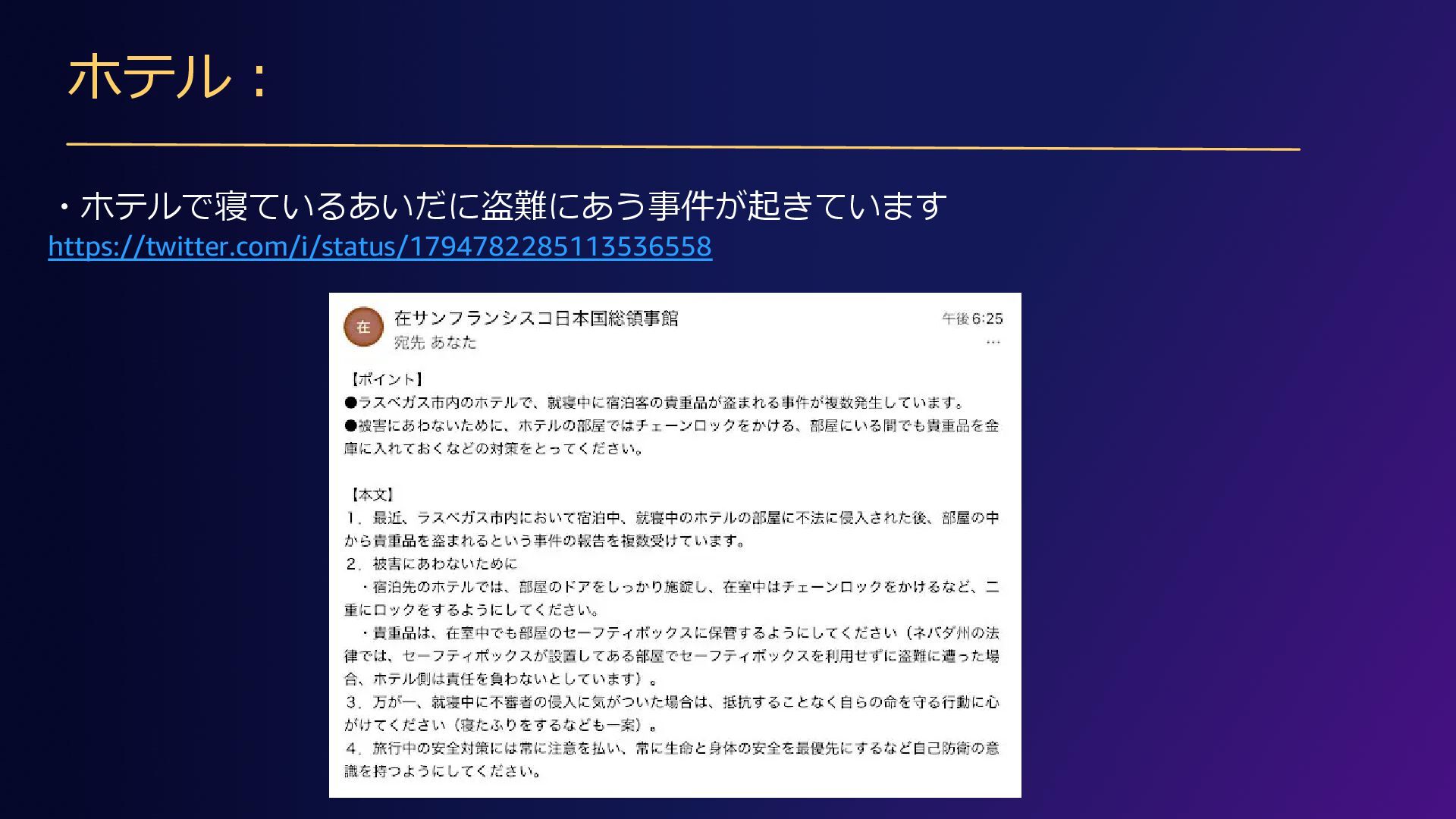 ホテル: ・ホテルで寝ているあいだに盗難にあう事件が起きています https://twitter.com/i/status/1794782285113536558