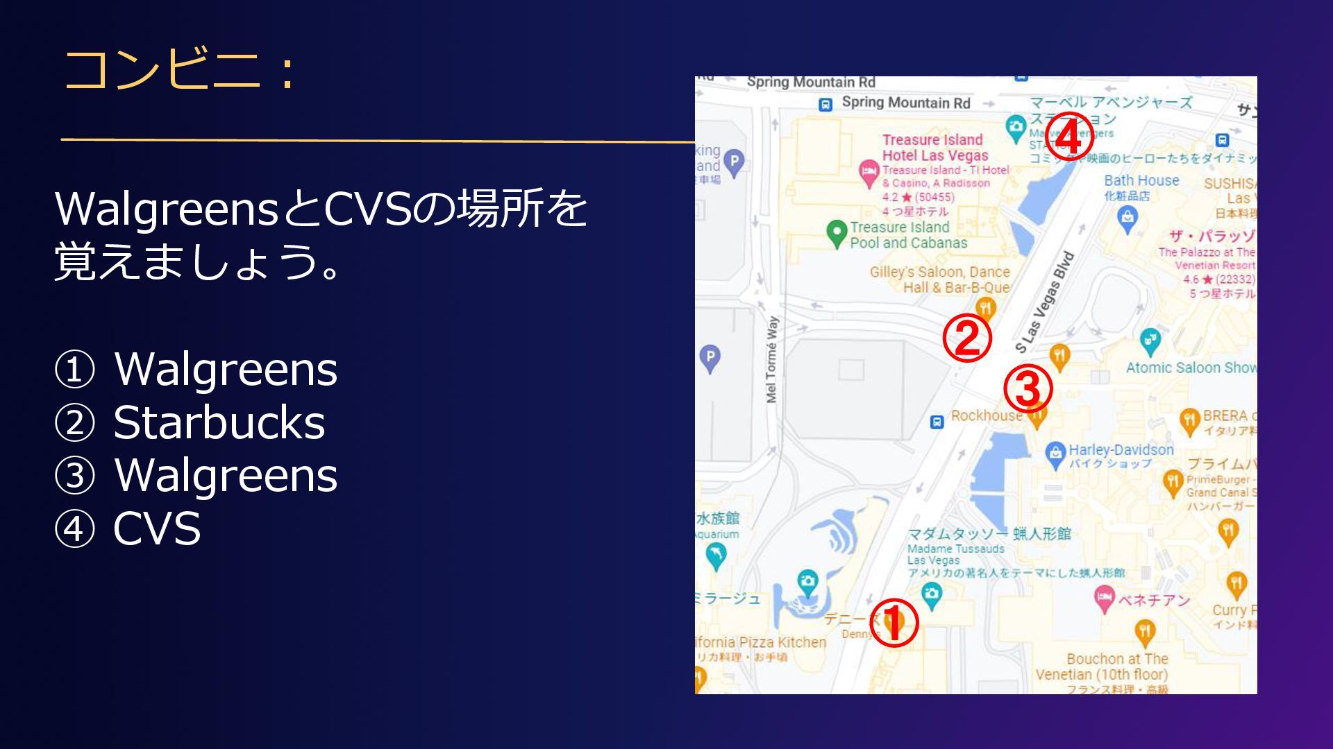 コンビニ: WalgreensとCVSの場所を 覚えましょう。 ① Walgreens ② Starbucks ③ Walgreens ④