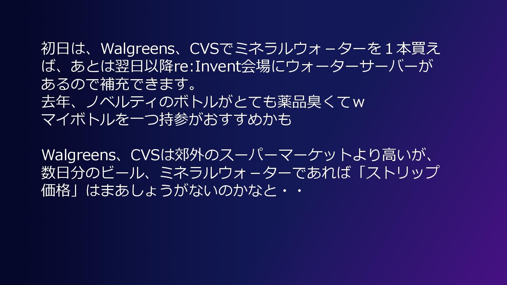 初日は、Walgreens、CVSでミネラルウォ-ターを1本買え ば、あとは翌日以降re:Invent会場にウォーターサーバーが あるので補充できます。 去年、ノベルティのボトルがとても薬品臭くてw マイボトルを一つ持参がおすすめかも Walgreens、CVSは郊外のスーパーマーケットより高いが、 数日分のビール、ミネラルウォ-ターであれば「ストリップ 価格」はまあしょうがないのかなと・・