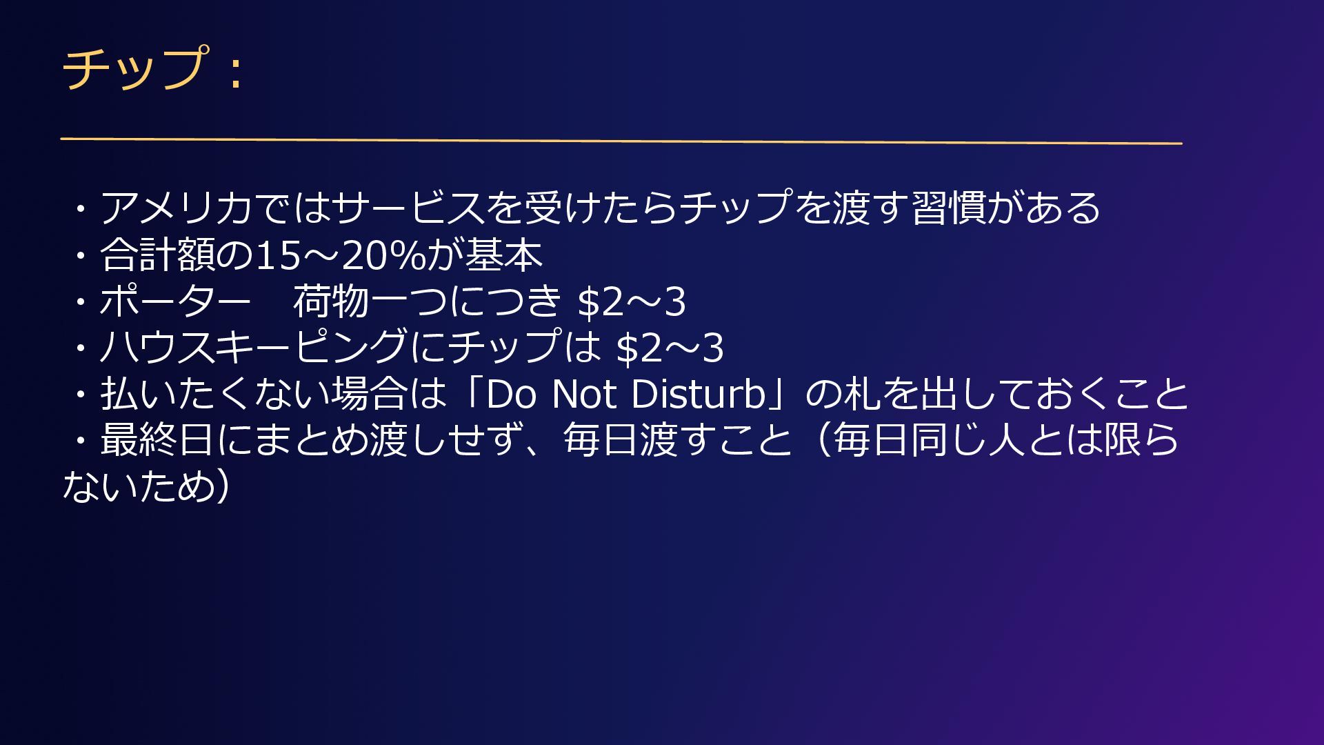 チップ: ・アメリカではサービスを受けたらチップを渡す習慣がある ・合計額の15〜20%が基本 ・ポーター 荷物一つにつき $2〜3 ・ハウスキーピングにチップは $2〜3 ・払いたくない場合は「Do Not