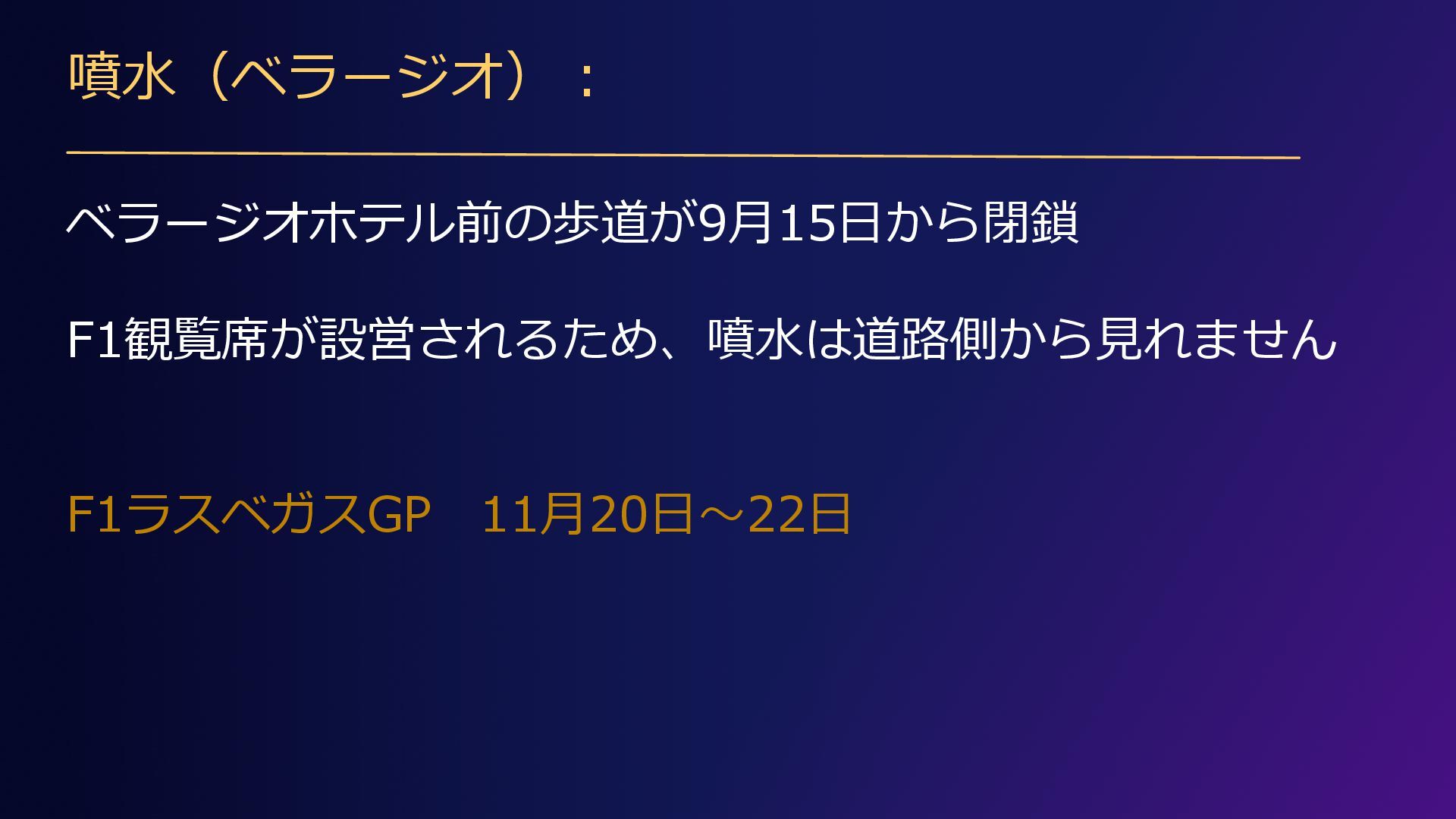 噴水(ベラージオ): ベラージオホテル前の歩道が9月15日から閉鎖 F1観覧席が設営されるため、噴水は道路側から見れません F1ラスベガスGP 11月20日〜22日