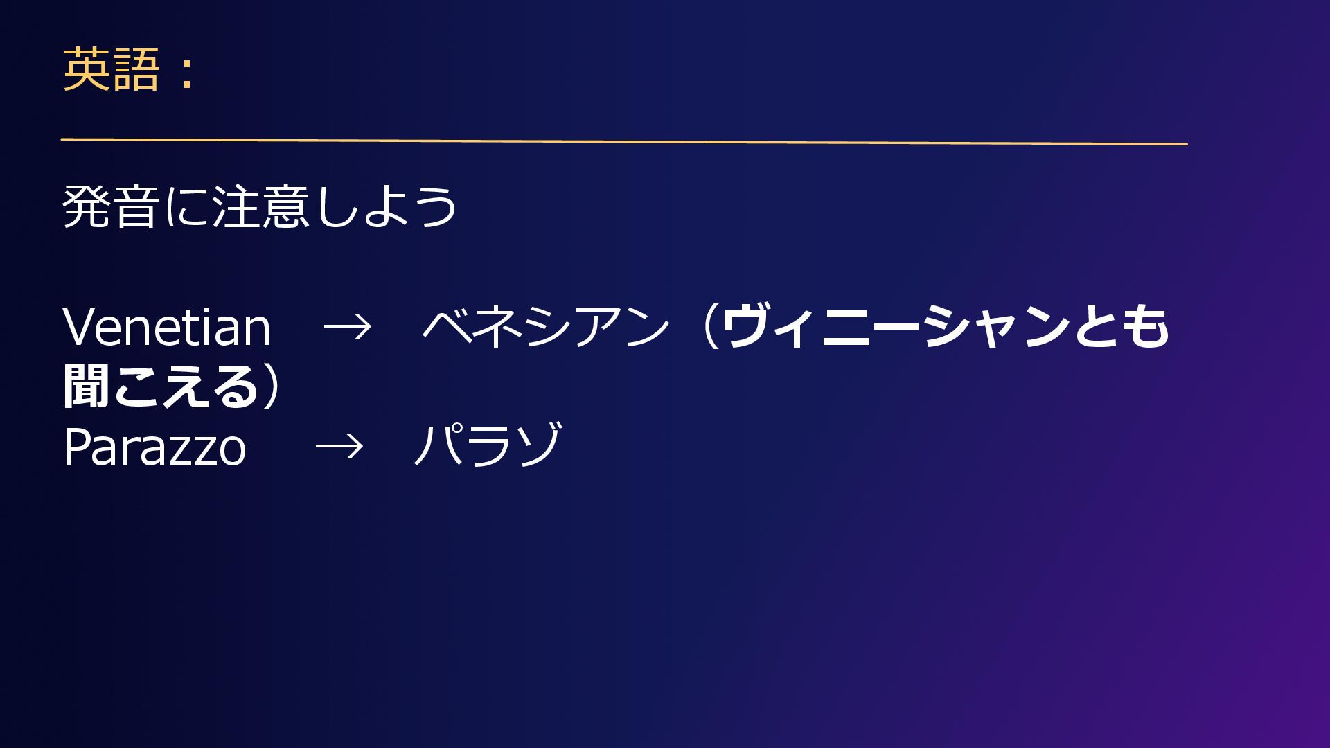 英語: 発音に注意しよう Venetian → ベネシアン(ヴィニーシャンとも 聞こえる) Parazzo → パラゾ