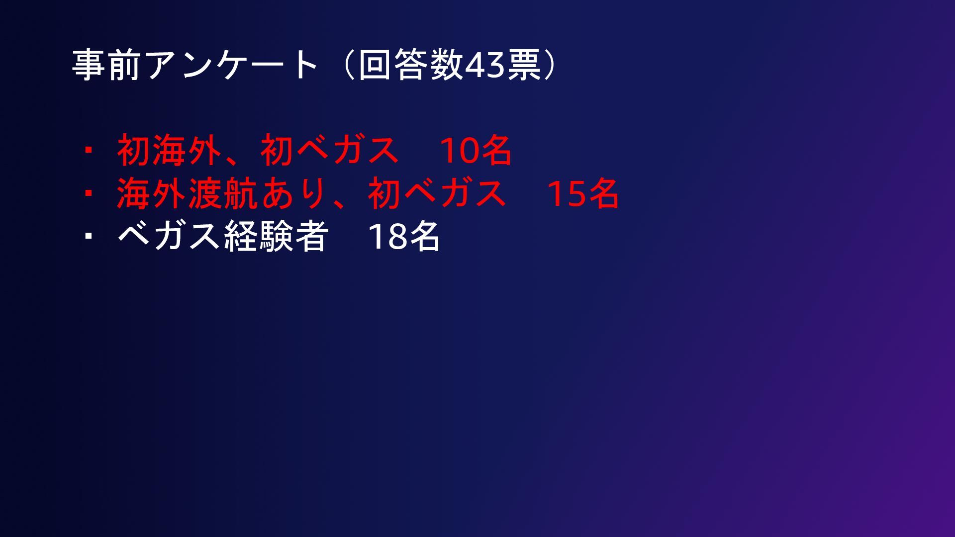 事前アンケート(回答数43票) ・ 初海外、初ベガス 10名 ・ 海外渡航あり、初ベガス 15名 ・ ベガス経験者 18名