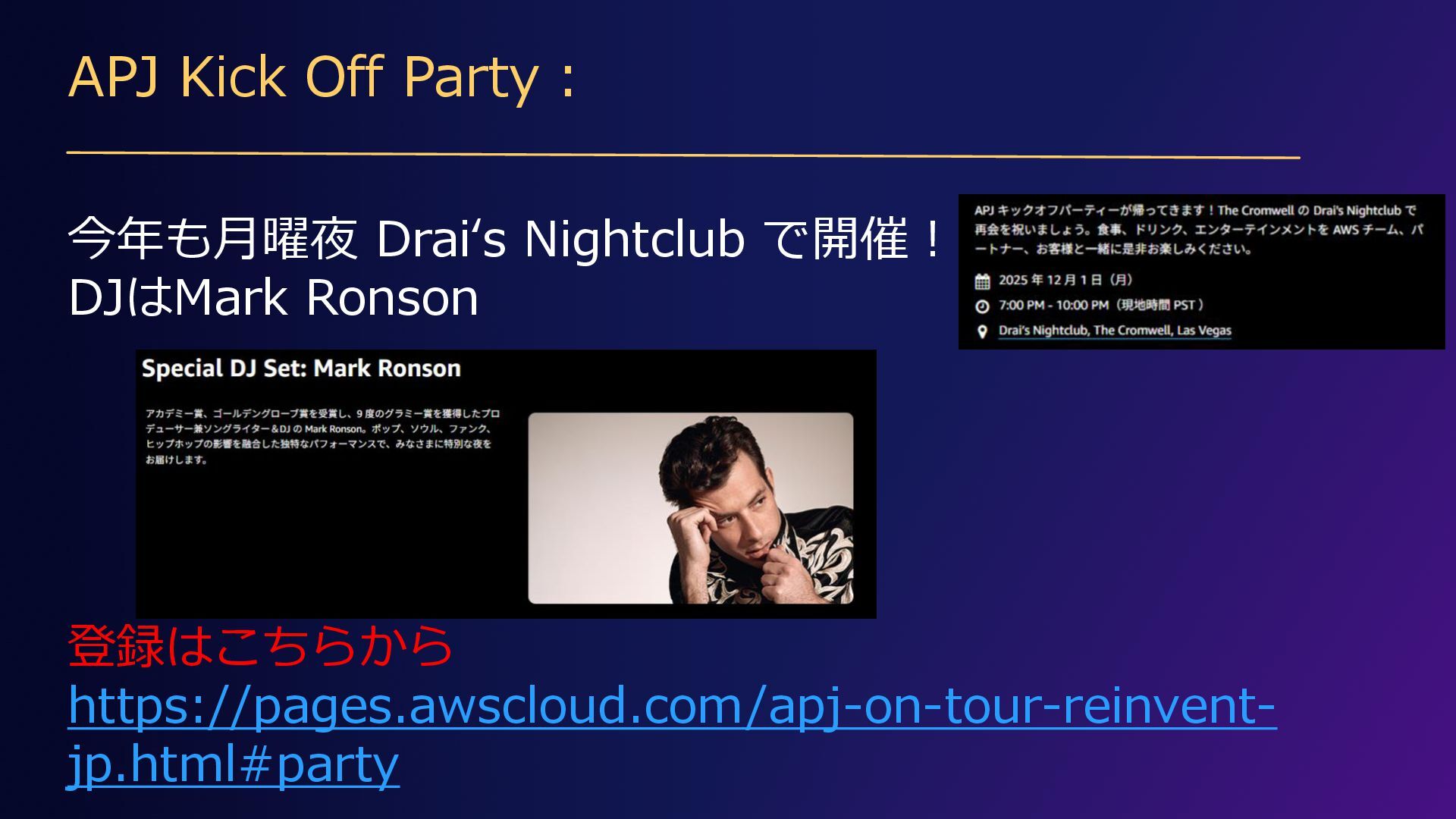 登録はこちらから https://pages.awscloud.com/apj-on-tour-reinvent- jp.html#party