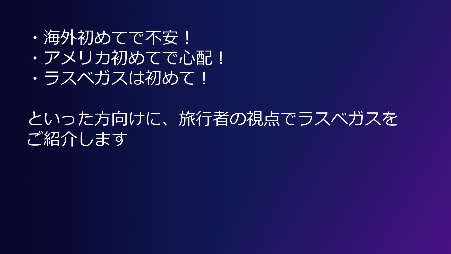 ・海外初めてで不安! ・アメリカ初めてで心配! ・ラスベガスは初めて! といった方向けに、旅行者の視点でラスベガスを ご紹介します