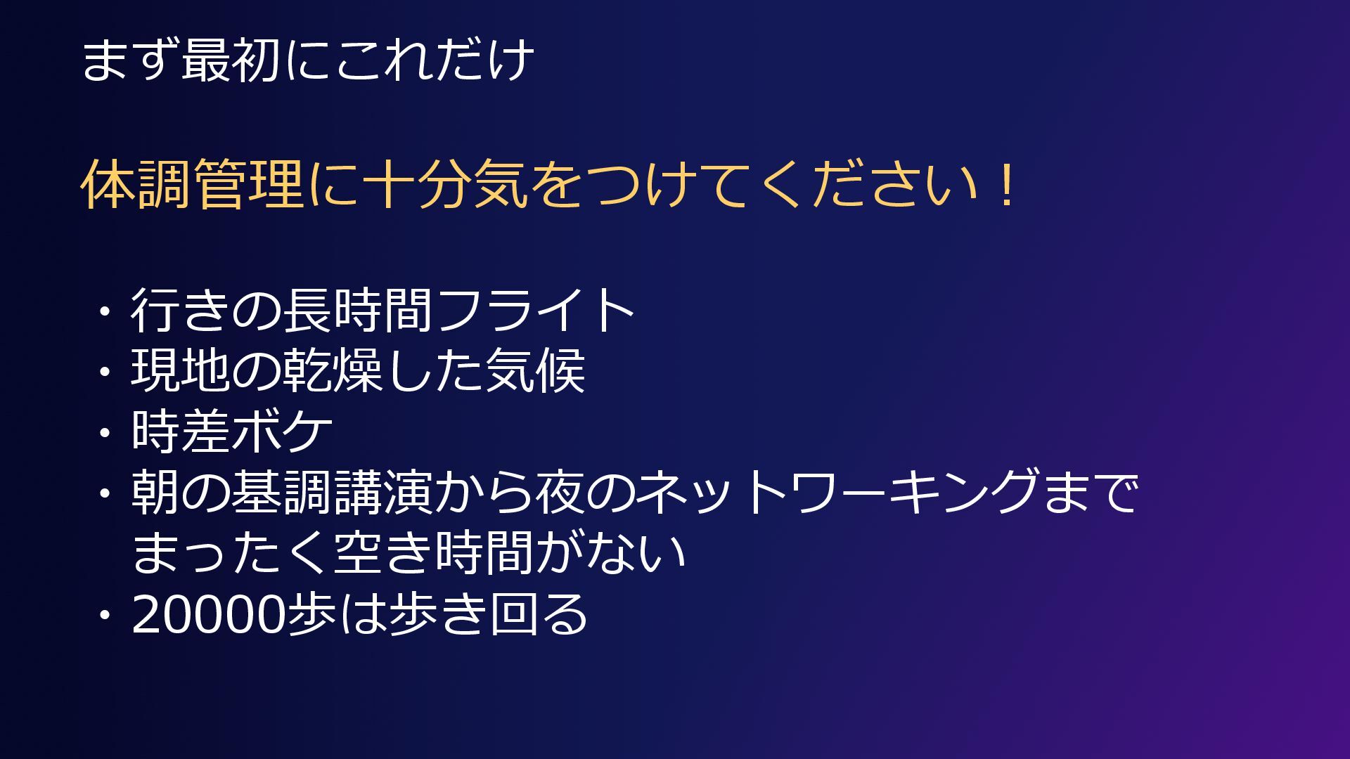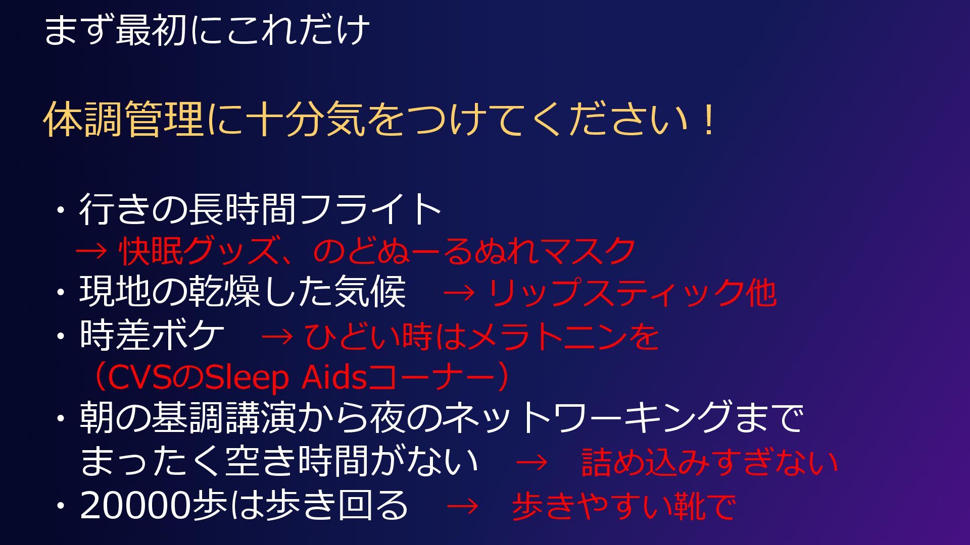 まず最初にこれだけ 体調管理に十分気をつけてください! ・行きの長時間フライト ・現地の乾燥した気候 ・時差ボケ ・朝の基調講演から夜のネットワーキングまで まったく空き時間がない ・20000歩は歩き回る
