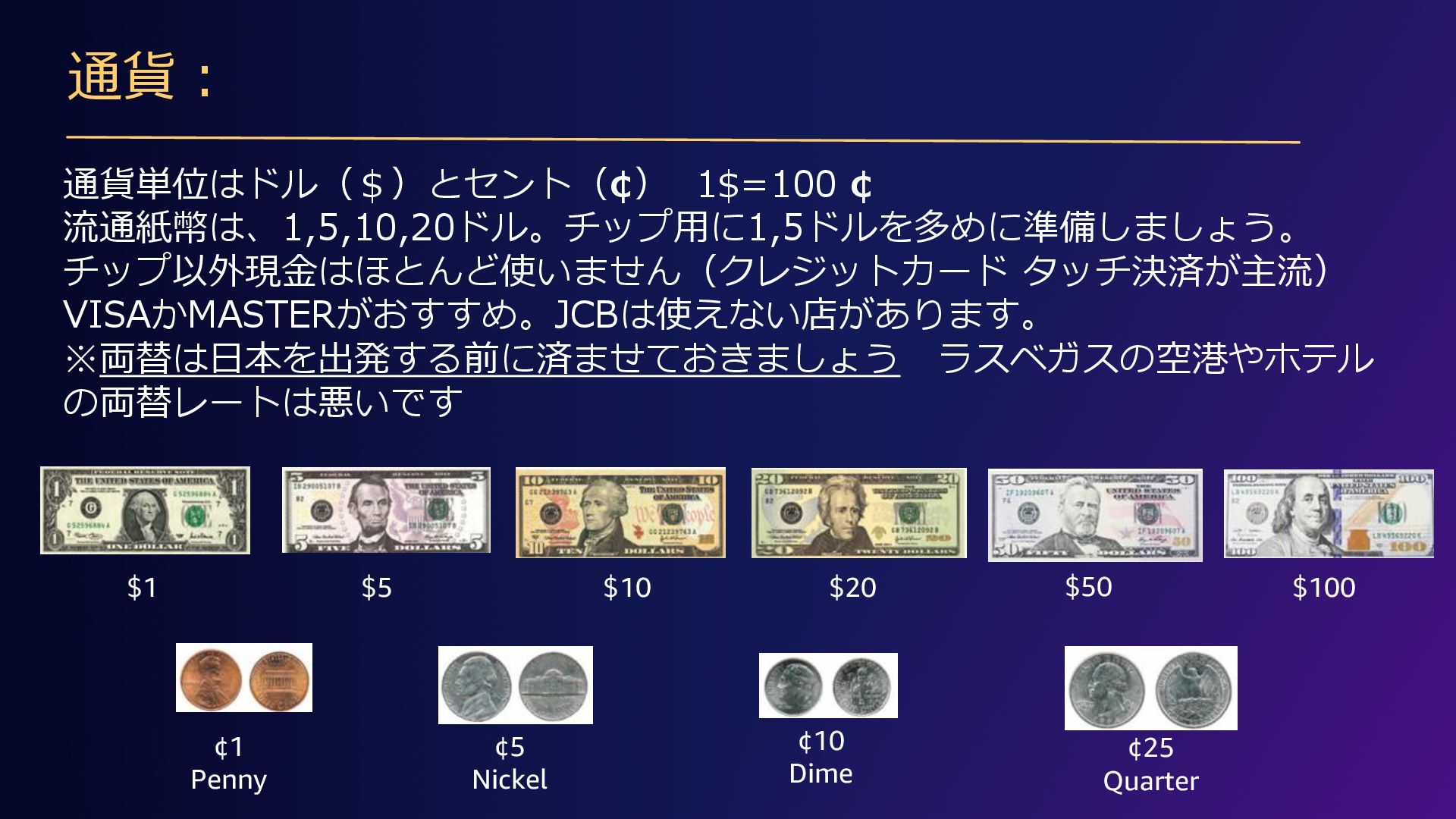 通貨: 通貨単位はドル($)とセント(¢) 1$=100 ¢ 流通紙幣は、1,5,10,20ドル。チップ用に1,5ドルを多めに準備しましょう。 チップ以外現金はほとんど使いません(クレジットカード タッチ決済が主流) VISAかMASTERがおすすめ。JCBは使えない店があります。 ※両替は日本を出発する前に済ませておきましょう ラスベガスの空港やホテル