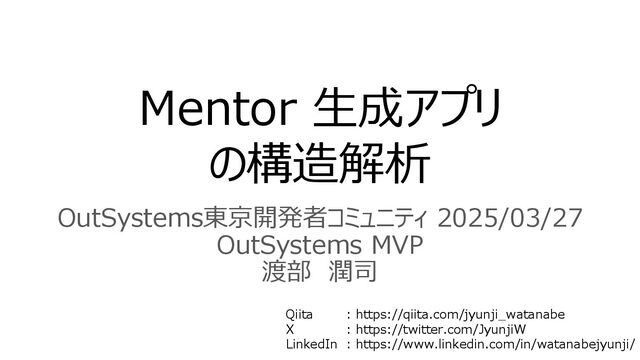 Mentor 生成アプリ の構造解析 OutSystems東京開発者コミュニティ 2025/03/27 OutSystems MVP 渡部 潤司 :