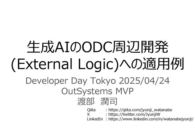 Lambda上で動作する点については、以下のONE2023の動画で確認できる o ONE Conference 2023. 「‘Level Up’ Your Low-Code Game with New Innovations 19:20あたりのスライ ド」.https://learn.outsystems.com/training/journeys/one-conference-2023-695/-level-up-your-low-code- game-with-new-innovations/odc/3832, (参照2024-04-18) o ONE Conference 2023. 「Extending ODC: the new Integrations capabilities of ODC 28:00あたりの説 明」. https://learn.outsystems.com/training/journeys/one-conference-2023-695/extending-odc-the-new- integrations-capabilities-of-odc-/odc/3821, (参照2024-04-18) 3. Qiita. 「External LogicをVisual Studio Codeで作成する」. https://qiita.com/jyunji_watanabe/items/04ffd0bc25ed4e845661 4. NuGet. 「ClosedXML Version 0.104.2」. https://www.nuget.org/packages/ClosedXML/0.104.2 5. Qiita. 「生成AI(GitHub Copilot)にODC向けの非同期JavaScriptを書かせてみる」. https://qiita.com/jyunji_watanabe/items/1f3e05ab985c85495991