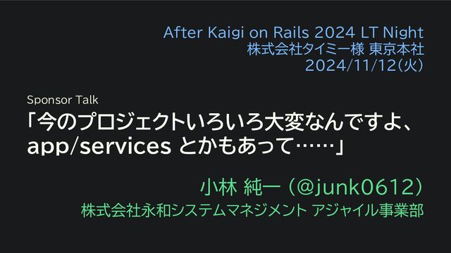 株式会社タイミー様 東京本社 2024/11/12(火) 小林 純一 (@junk0612) 株式会社永和システムマネジメント アジャイル事業部 Sponsor Talk