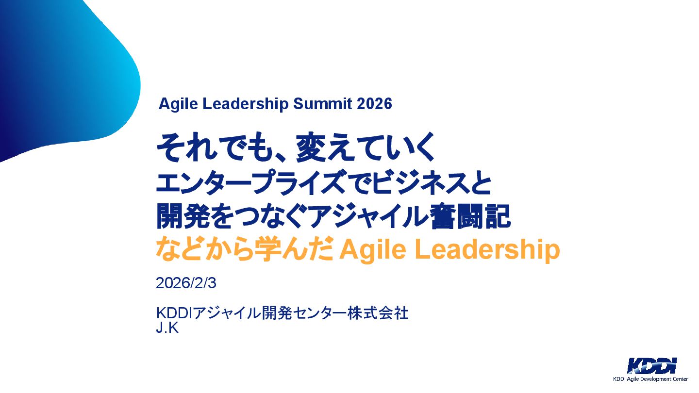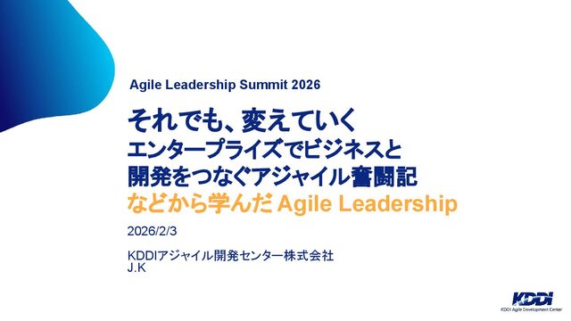 それでも、変えていく エンタープライズでビジネスと 開発をつなぐアジャイル奮闘記 などから学んだ Agile Leadership 2026/2/3 KDDIアジャイル開発センター株式会社 J.K Agile