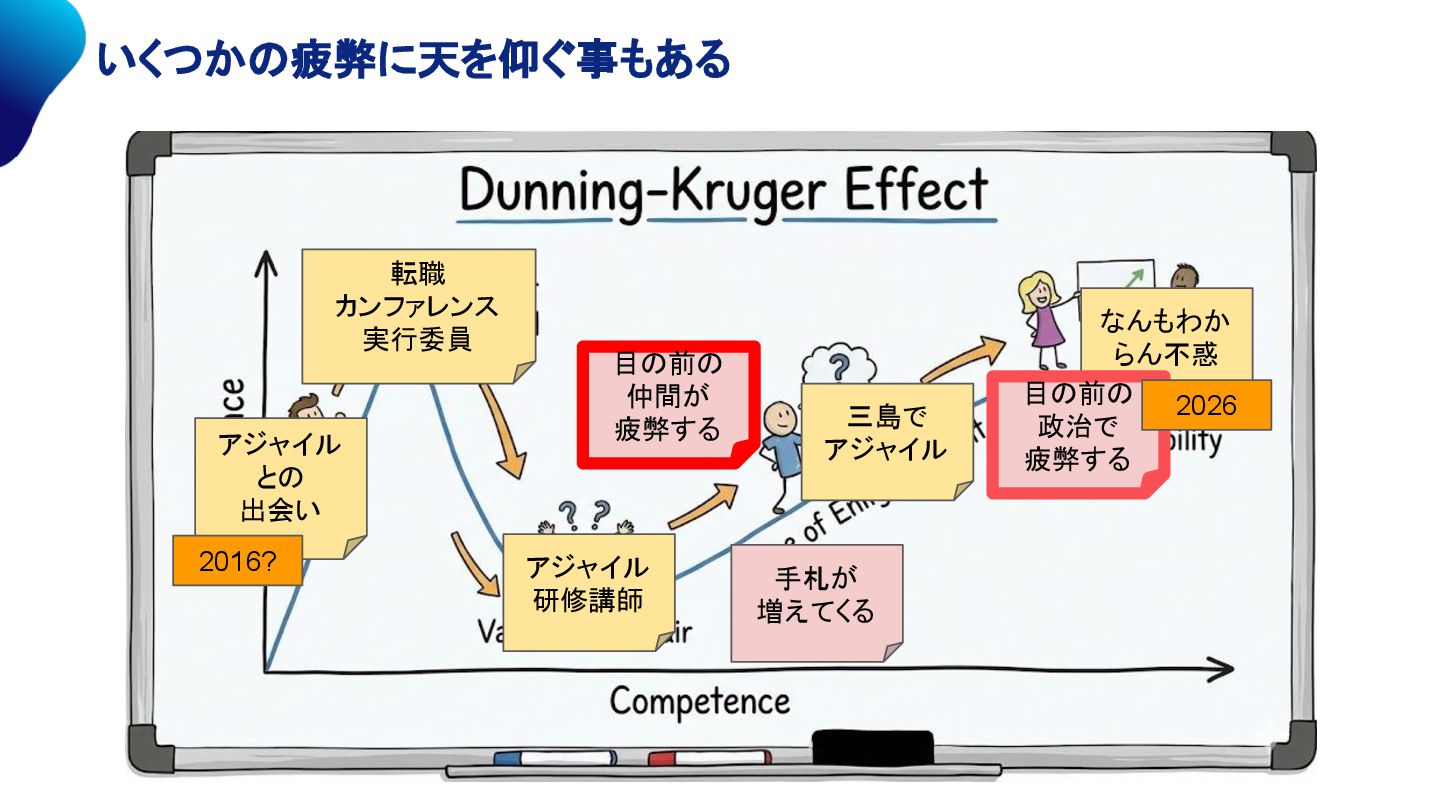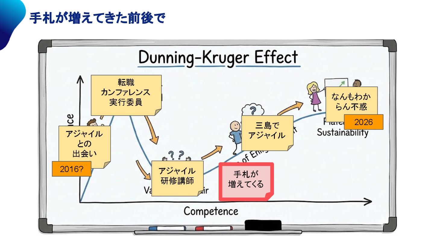 アジャイル なんもわか らん不惑 手札が 増えてくる 目の前の 仲間が 疲弊する 目の前の 政治で 疲弊する 2016? 2026
