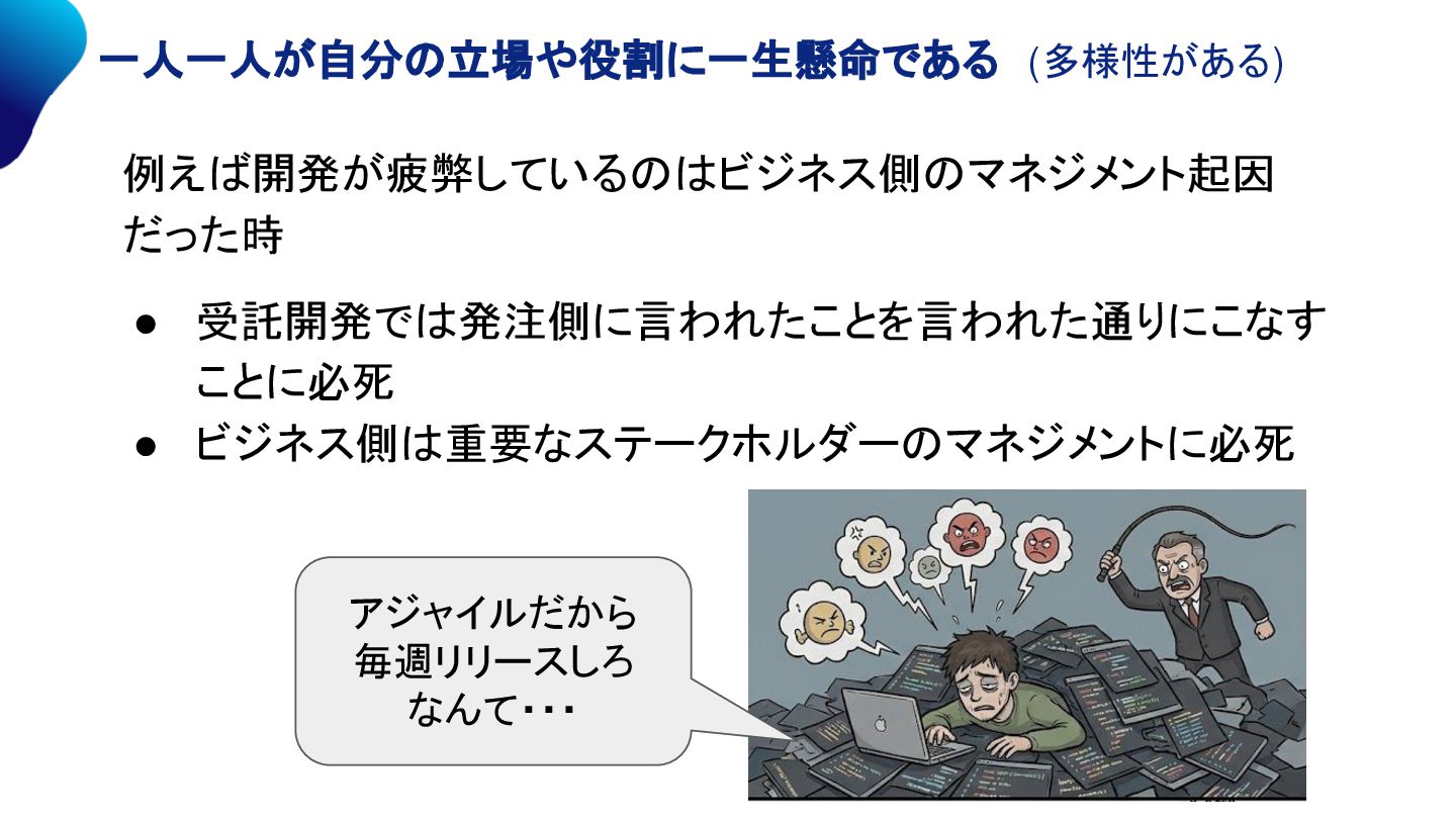 一人一人が自分の立場や役割に一生懸命である (多様性がある) 例えば開発が疲弊しているのはビジネス側のマネジメント起因 だった時 • 受託開発では発注側に言われたことを言われた通りにこなす ことに必死 • ビジネス側は重要なステークホルダーのマネジメントに必死