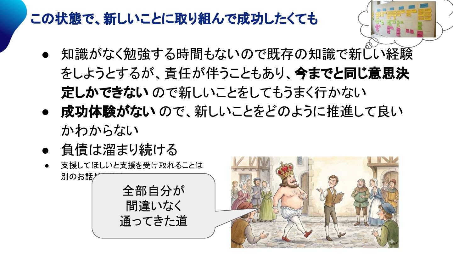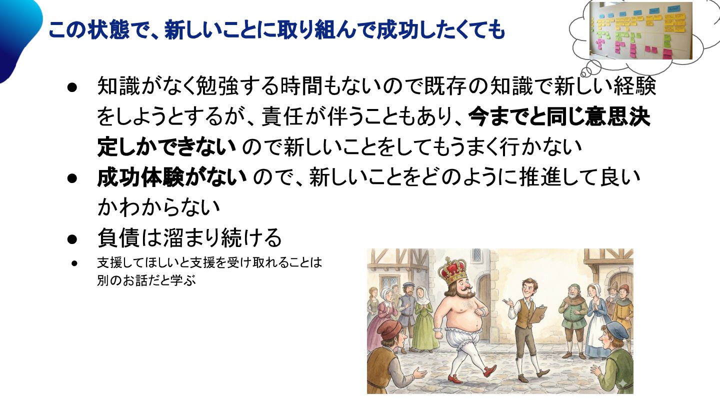 この状態で、新しいことに取り組んで成功したくても • 知識がなく勉強する時間もないので既存の知識で新しい経験 をしようとするが、責任が伴うこともあり、今までと同じ意思決 定しかできない ので新しいことをしてもうまく行かない • 成功体験がない ので、新しいことをどのように推進して良い かわからない