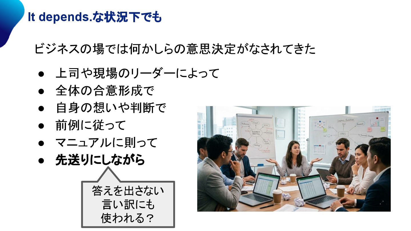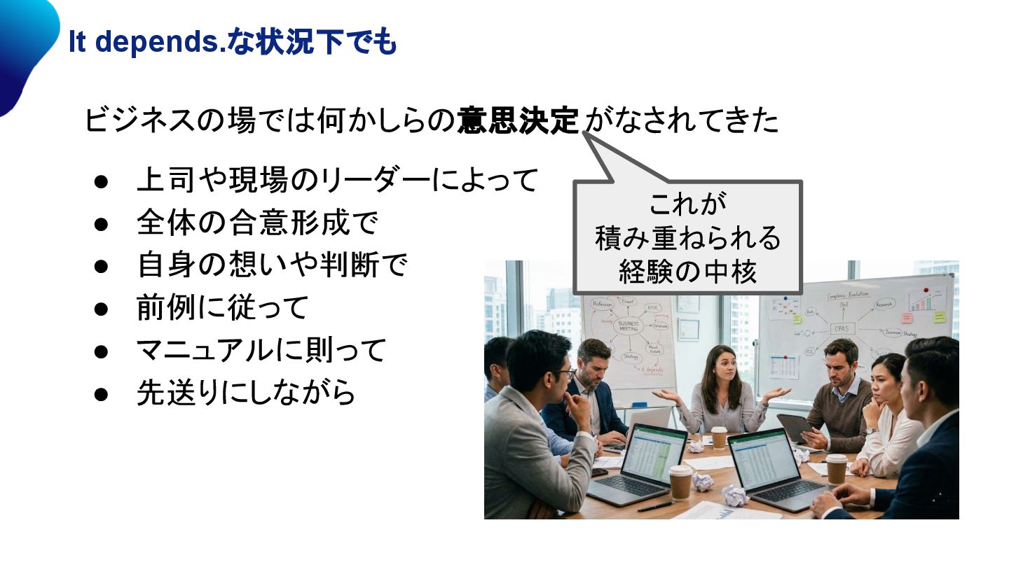 It depends.な状況下でも ビジネスの場では何かしらの意思決定がなされてきた • 上司や現場のリーダーによって • 全体の合意形成で • 自身の想いや判断で •