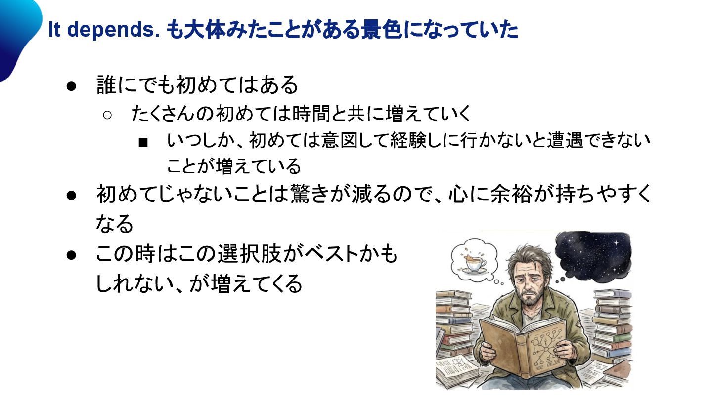 It depends. も大体みたことがある景色になっていた • 誰にでも初めてはある ◦ たくさんの初めては時間と共に増えていく ▪ いつしか、初めては意図して経験しに行かないと遭遇できない ことが増えている