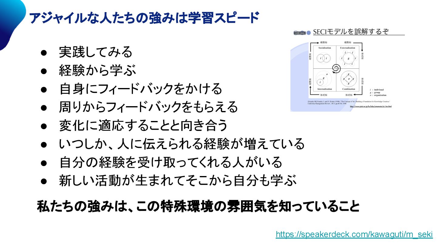 変化に適応することと向き合う • いつしか、人に伝えられる経験が増えている • 自分の経験を受け取ってくれる人がいる • 新しい活動が生まれてそこから自分も学ぶ 私たちの強みは、この特殊環境の雰囲気を知っていること https://speakerdeck.com/kawaguti/m_seki
