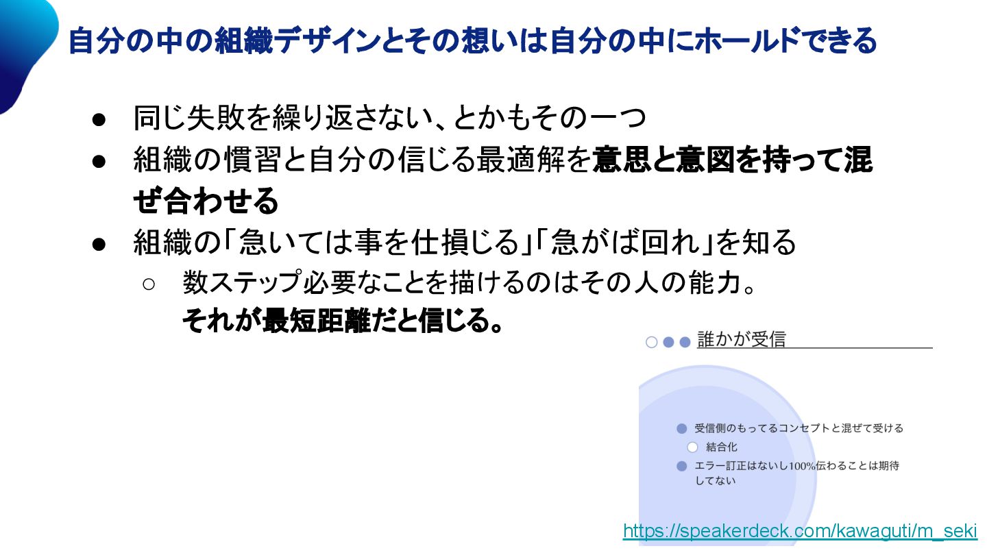 自分の中の組織デザインとその想いは自分の中にホールドできる https://speakerdeck.com/kawaguti/m_seki