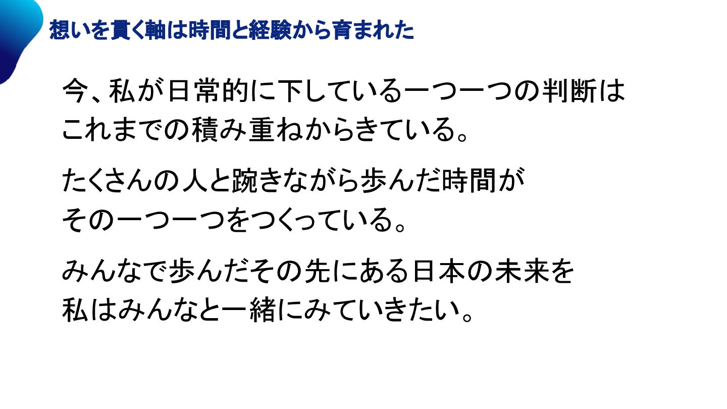 想いを貫く軸は時間と経験から育まれた 今、私が日常的に下している一つ一つの判断は これまでの積み重ねからきている。 たくさんの人と踠きながら歩んだ時間が その一つ一つをつくっている。 みんなで歩んだその先にある日本の未来を 私はみんなと一緒にみていきたい。