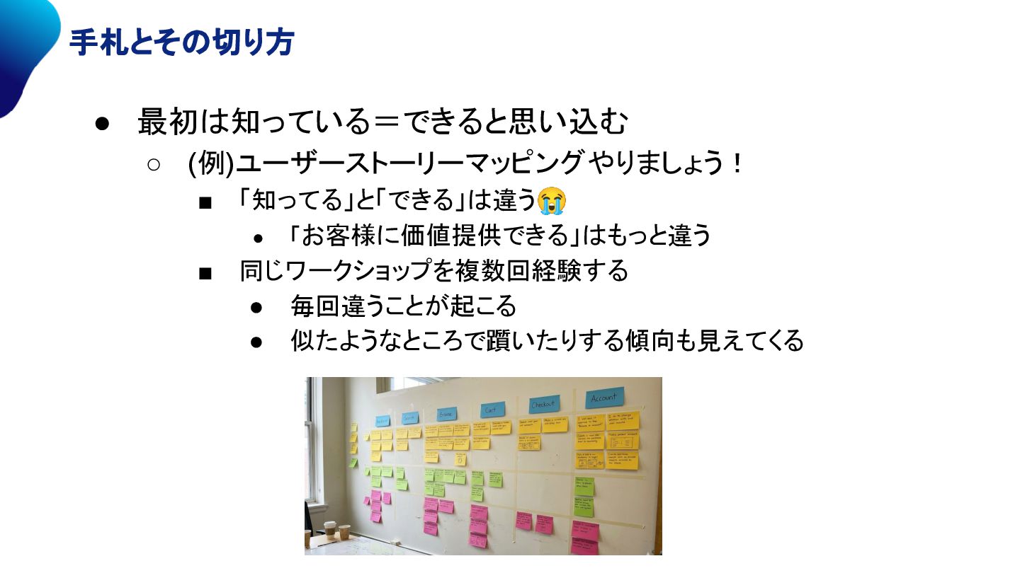手札とその切り方 • 最初は知っている=できると思い込む ◦ (例)ユーザーストーリーマッピングやりましょう! ▪ 「知ってる」と「できる」は違う😭 • 「お客様に価値提供できる」はもっと違う ▪