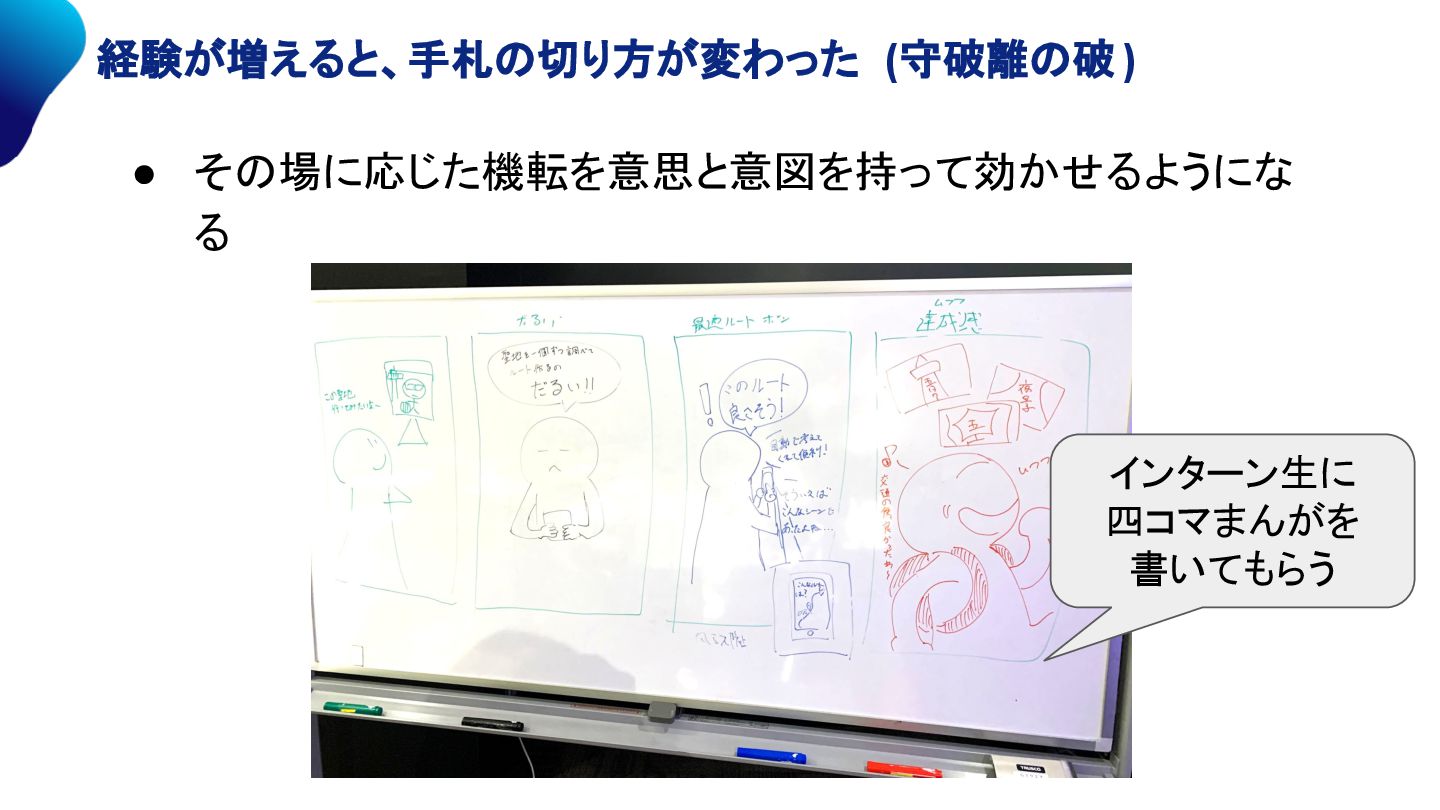 経験が増えると、手札の切り方が変わった (守破離の破 ) • その場に応じた機転を意思と意図を持って効かせるようにな る インターン生に 四コマまんがを 書いてもらう
