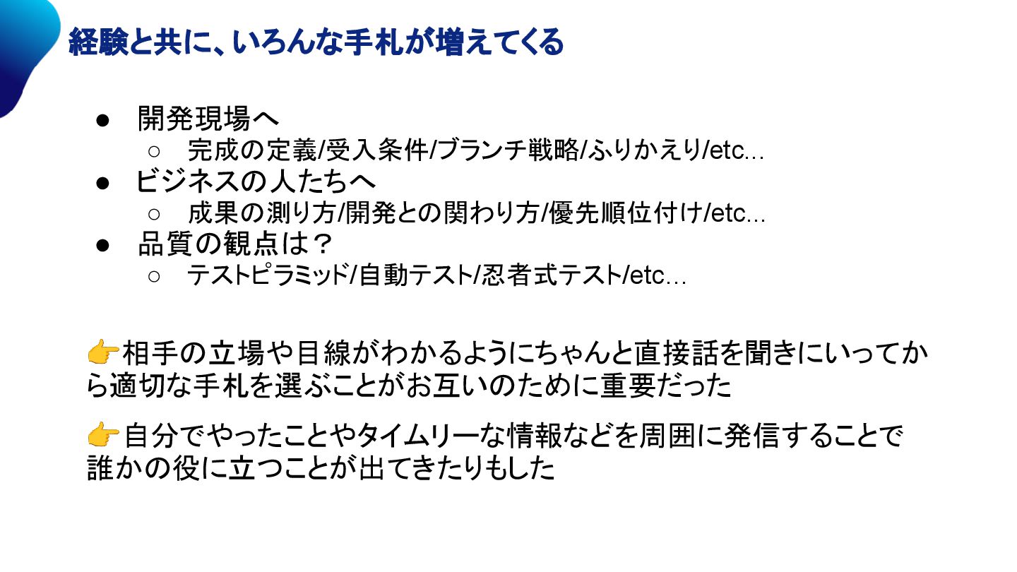 経験と共に、いろんな手札が増えてくる • 開発現場へ ◦ 完成の定義/受入条件/ブランチ戦略/ふりかえり/etc... • ビジネスの人たちへ ◦ 成果の測り方/開発との関わり方/優先順位付け/etc... •