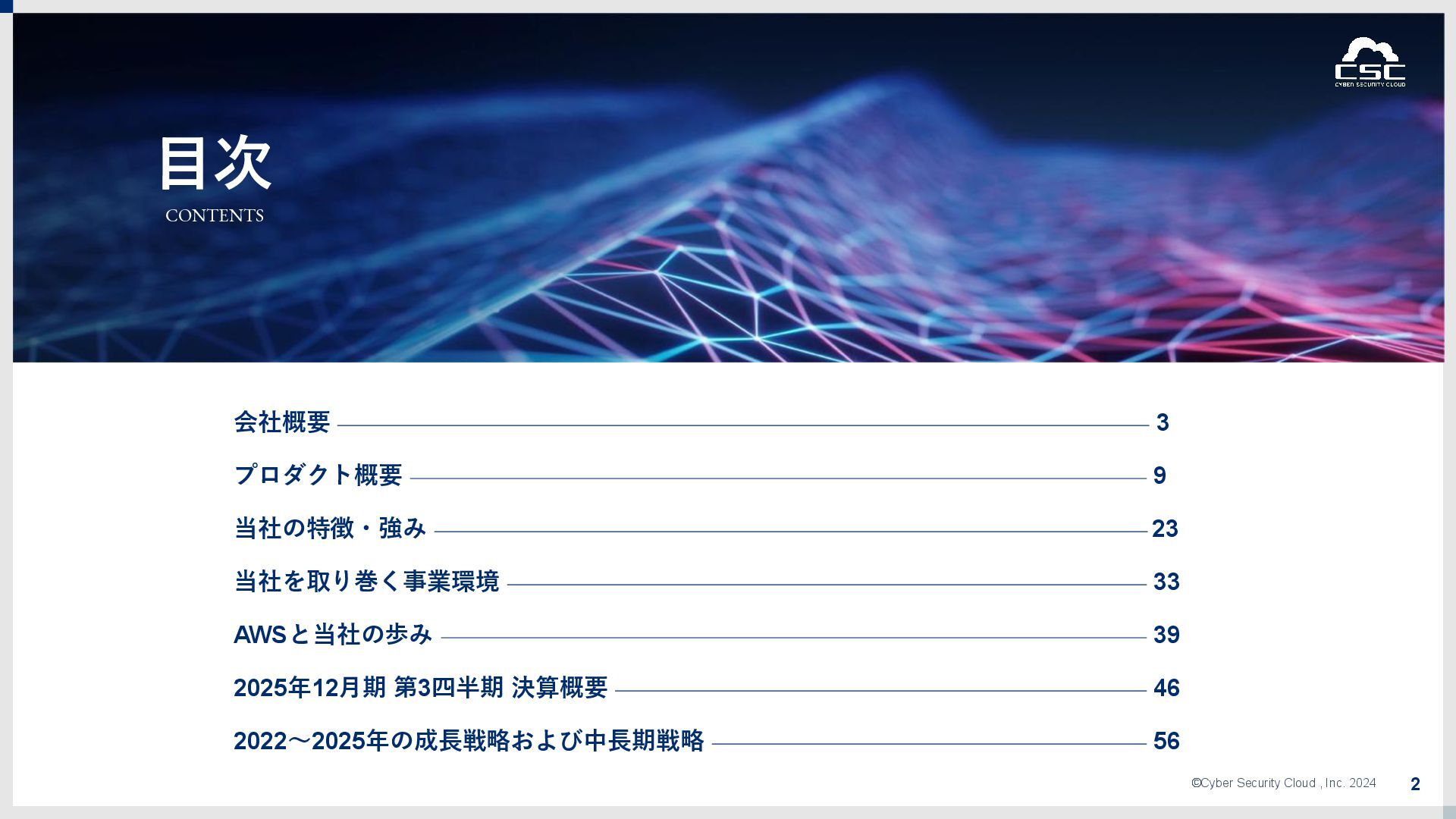 3 プロダクト概要 9 当社の特徴・強み 23 当社を取り巻く事業環境 33 AWSと当社の歩み 39 2025年12月期 第3四半期 決算概要 46 2022~2025年の成長戦略および中長期戦略 56