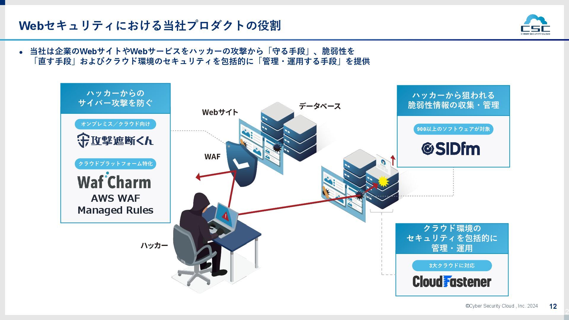 8. 12 ©Cyber Security Cloud , Inc. 2024 Webセキュリティにおける当社プロダクトの役割 • 当社は企業のWebサイトやWebサービスをハッカーの攻撃から「守る手段」、脆弱性を