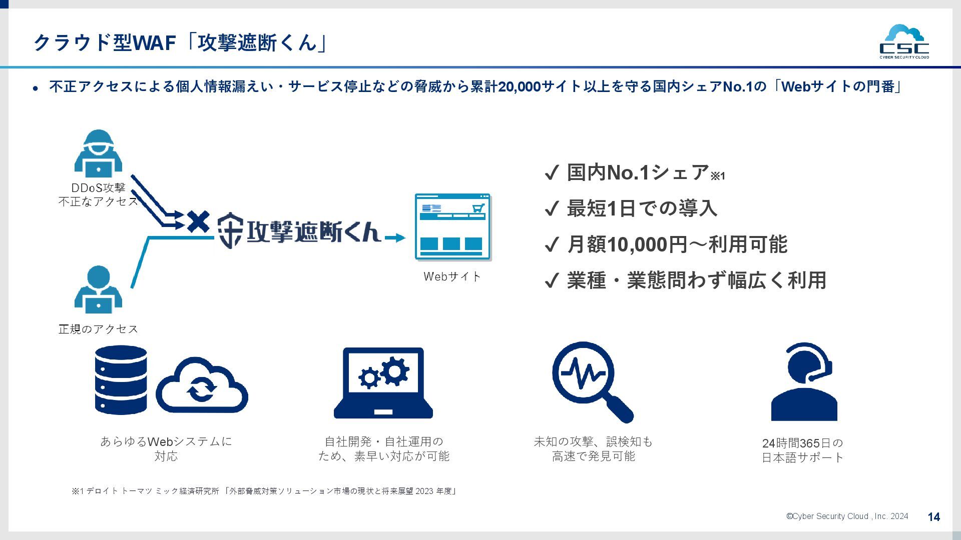 24時間365日の 日本語サポート あらゆるWebシステムに 対応 ✔ 国内No.1シェア※1 ✔ 最短1日での導入 ✔ 月額10,000円~利用可能 ✔ 業種・業態問わず幅広く利用 未知の攻撃、誤検知も 高速で発見可能 ※1 デロイト トーマツ ミック経済研究所 「外部脅威対策ソリューション市場の現状と将来展望 2023 年度」 自社開発・自社運用の ため、素早い対応が可能