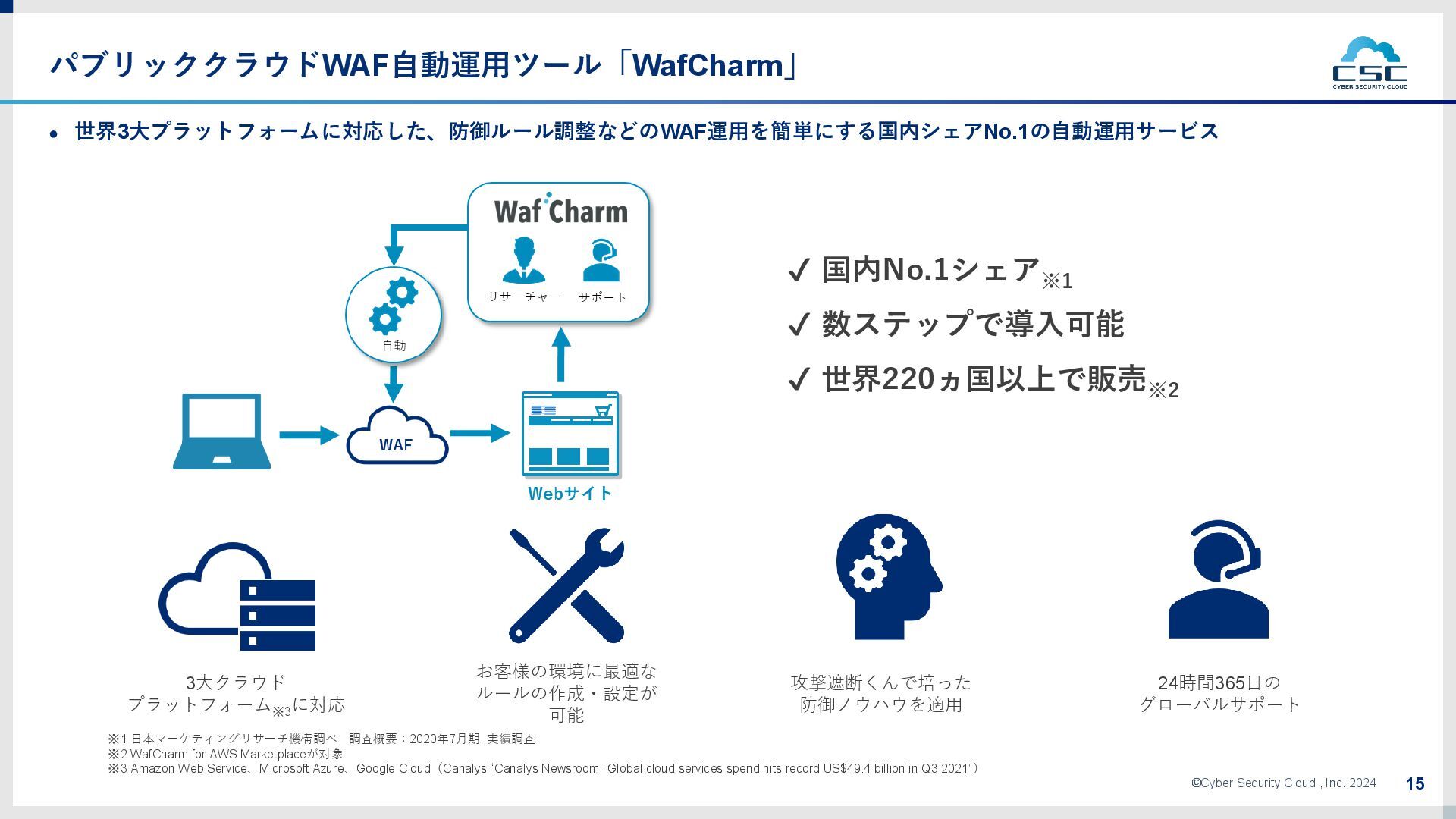 11. 15 ©Cyber Security Cloud , Inc. 2024 パブリッククラウドWAF自動運用ツール「WafCharm」 • 世界3大プラットフォームに対応した、防御ルール調整などのWAF運用を簡単にする国内シェアNo.1の自動運用サービス