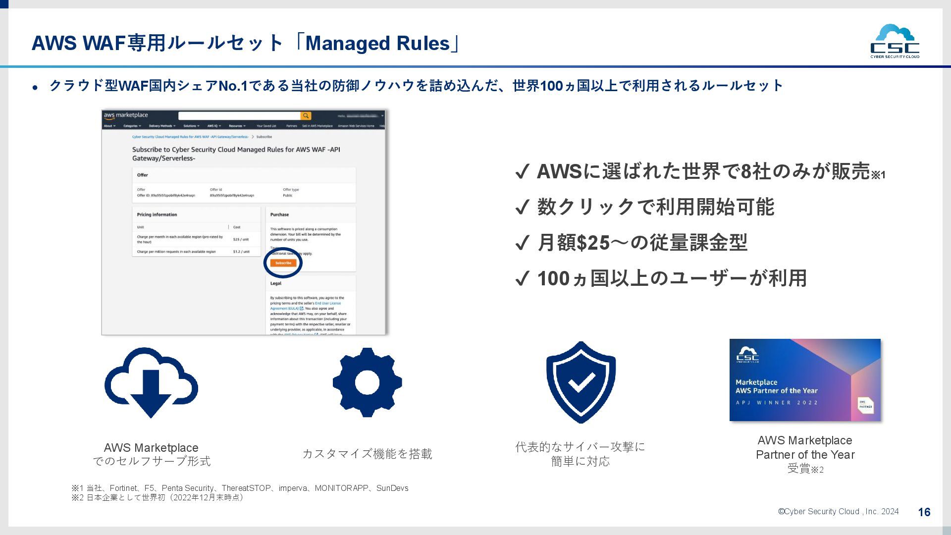 • クラウド型WAF国内シェアNo.1である当社の防御ノウハウを詰め込んだ、世界100ヵ国以上で利用されるルールセット カスタマイズ機能を搭載 AWS Marketplace Partner of the Year 受賞※2 AWS Marketplace でのセルフサーブ形式 代表的なサイバー攻撃に 簡単に対応 ※1 当社、Fortinet、F5、Penta Security、ThereatSTOP、imperva、MONITORAPP、SunDevs ※2 日本企業として世界初(2022年12月末時点) ✔ AWSに選ばれた世界で8社のみが販売※1 ✔ 数クリックで利用開始可能 ✔ 月額$25~の従量課金型 ✔ 100ヵ国以上のユーザーが利用