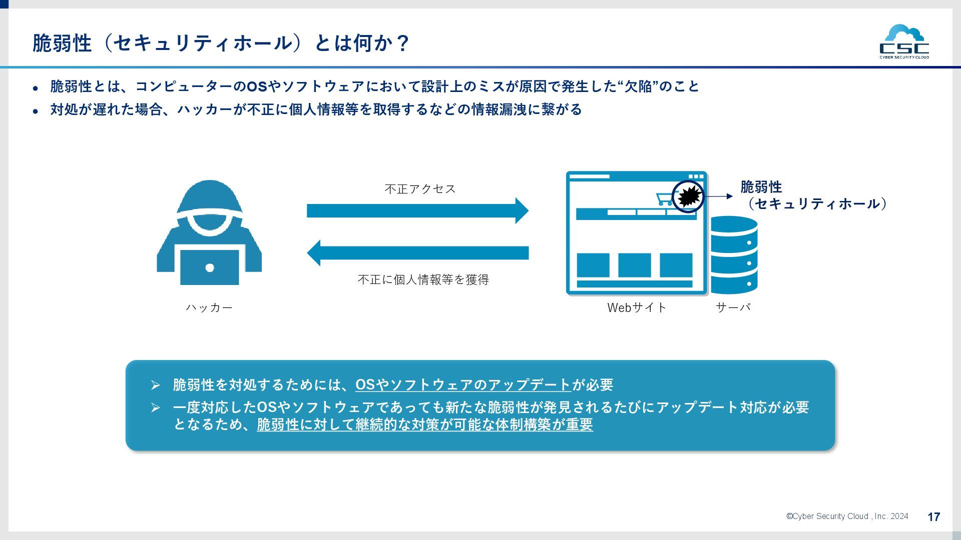 13. 17 ©Cyber Security Cloud , Inc. 2024 脆弱性(セキュリティホール)とは何か? • 脆弱性とは、コンピューターのOSやソフトウェアにおいて設計上のミスが原因で発生した“欠陥”のこと