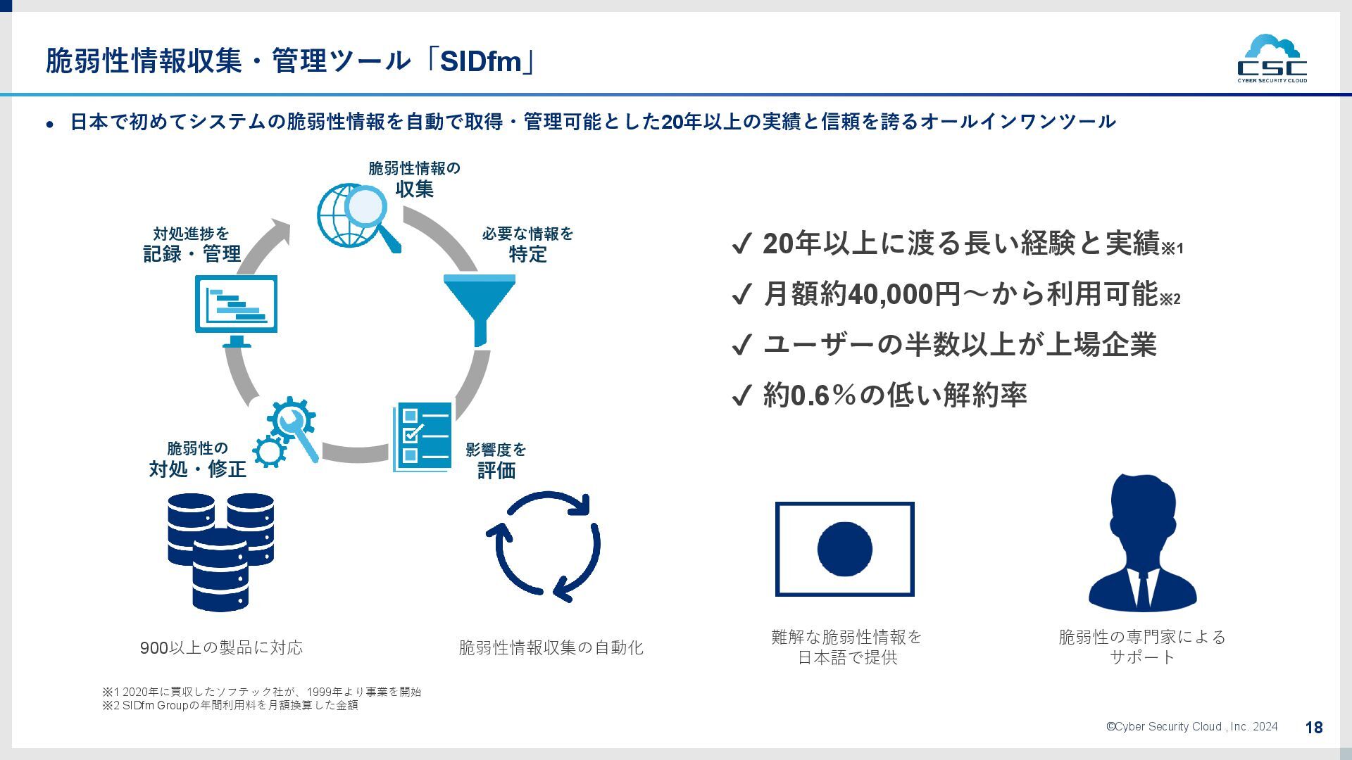 1つのツールで全ての工程を網羅可能 影響度を 評価 脆弱性の 対処・修正 対処進捗を 記録・管理 必要な情報を 特定 脆弱性情報の 収集 900以上の製品に対応 脆弱性情報収集の自動化 難解な脆弱性情報を 日本語で提供 脆弱性の専門家による サポート ※1 2020年に買収したソフテック社が、1999年より事業を開始 ※2 SIDfm Groupの年間利用料を月額換算した金額 ✔ 20年以上に渡る長い経験と実績※1 ✔ 月額約40,000円~から利用可能※2 ✔ ユーザーの半数以上が上場企業 ✔ 約0.6%の低い解約率