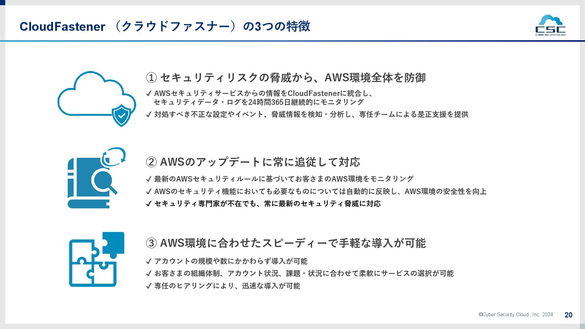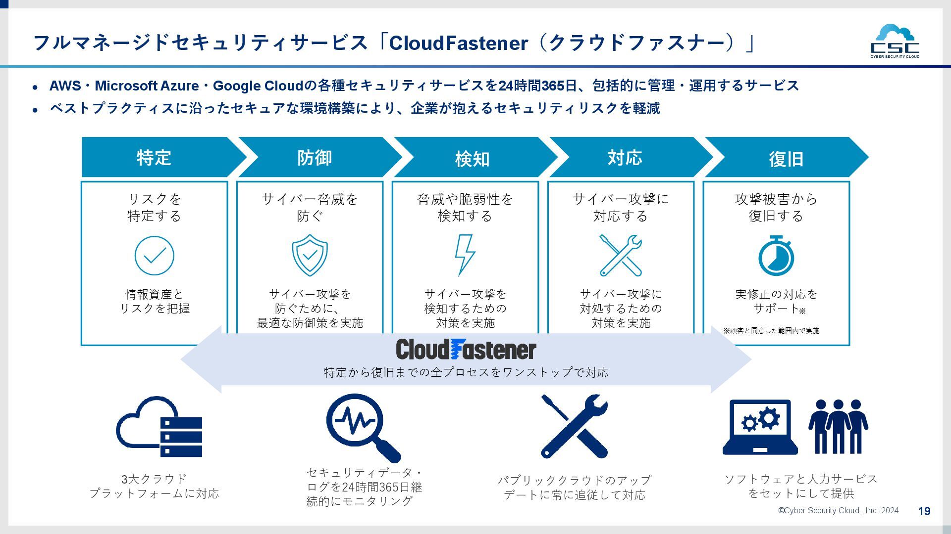 15. 19 ©Cyber Security Cloud , Inc. 2024 フルマネージドセキュリティサービス「CloudFastener(クラウドファスナー)」 • AWS・Microsoft