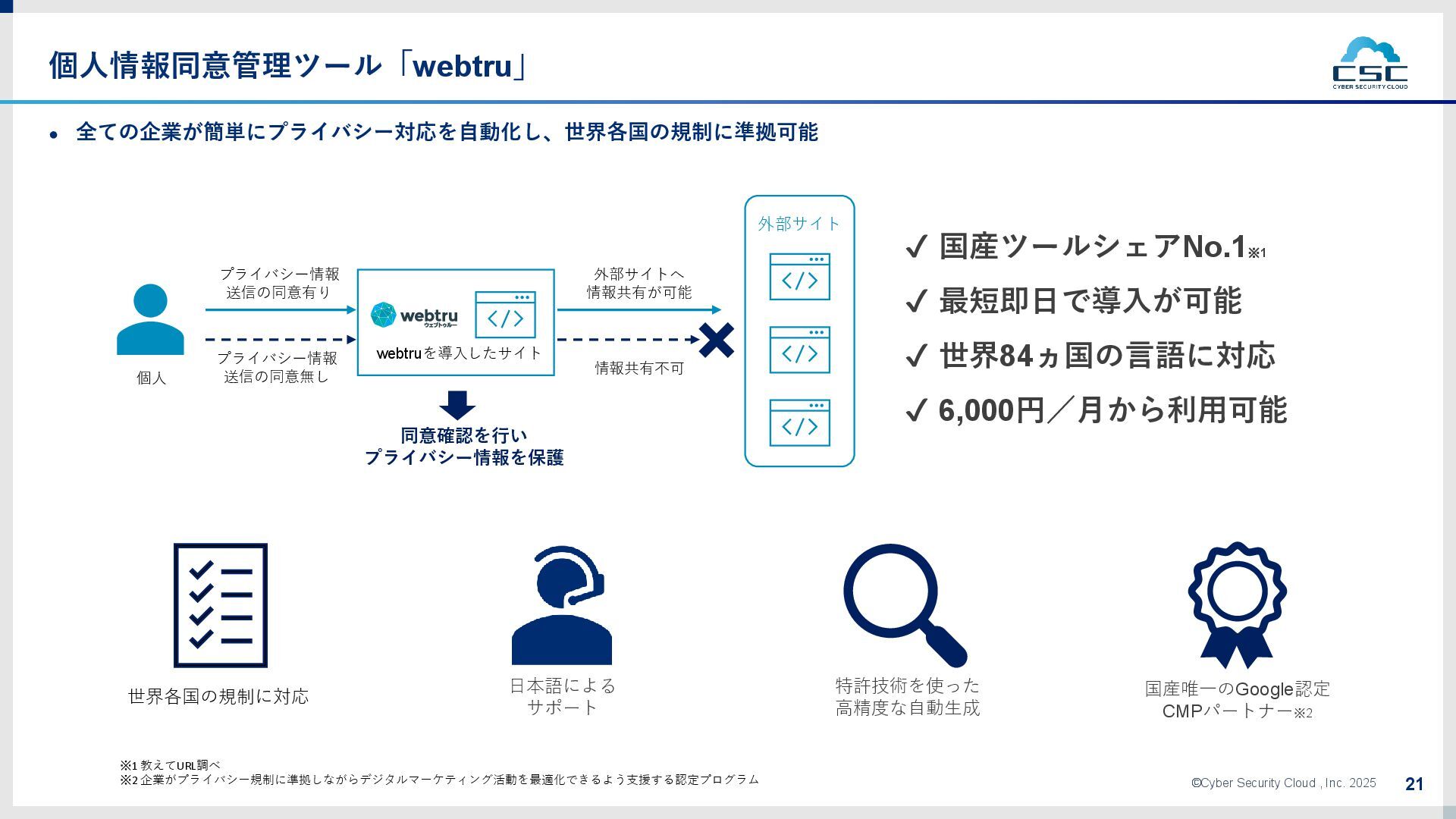17. 21 ©Cyber Security Cloud , Inc. 2025 個人情報同意管理ツール「webtru」 • 全ての企業が簡単にプライバシー対応を自動化し、世界各国の規制に準拠可能