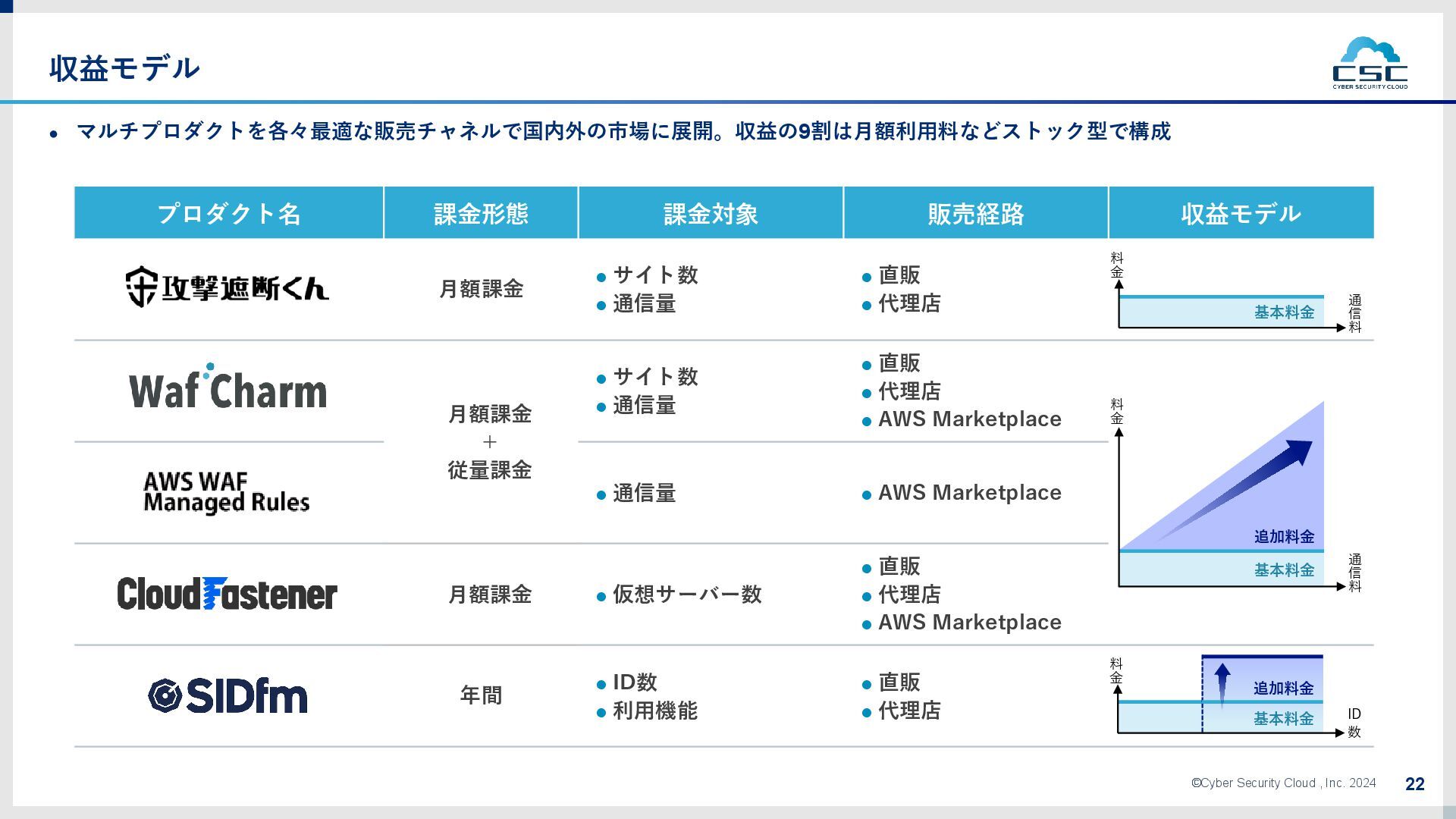 18. 22 ©Cyber Security Cloud , Inc. 2024 収益モデル • マルチプロダクトを各々最適な販売チャネルで国内外の市場に展開。収益の9割は月額利用料などストック型で構成