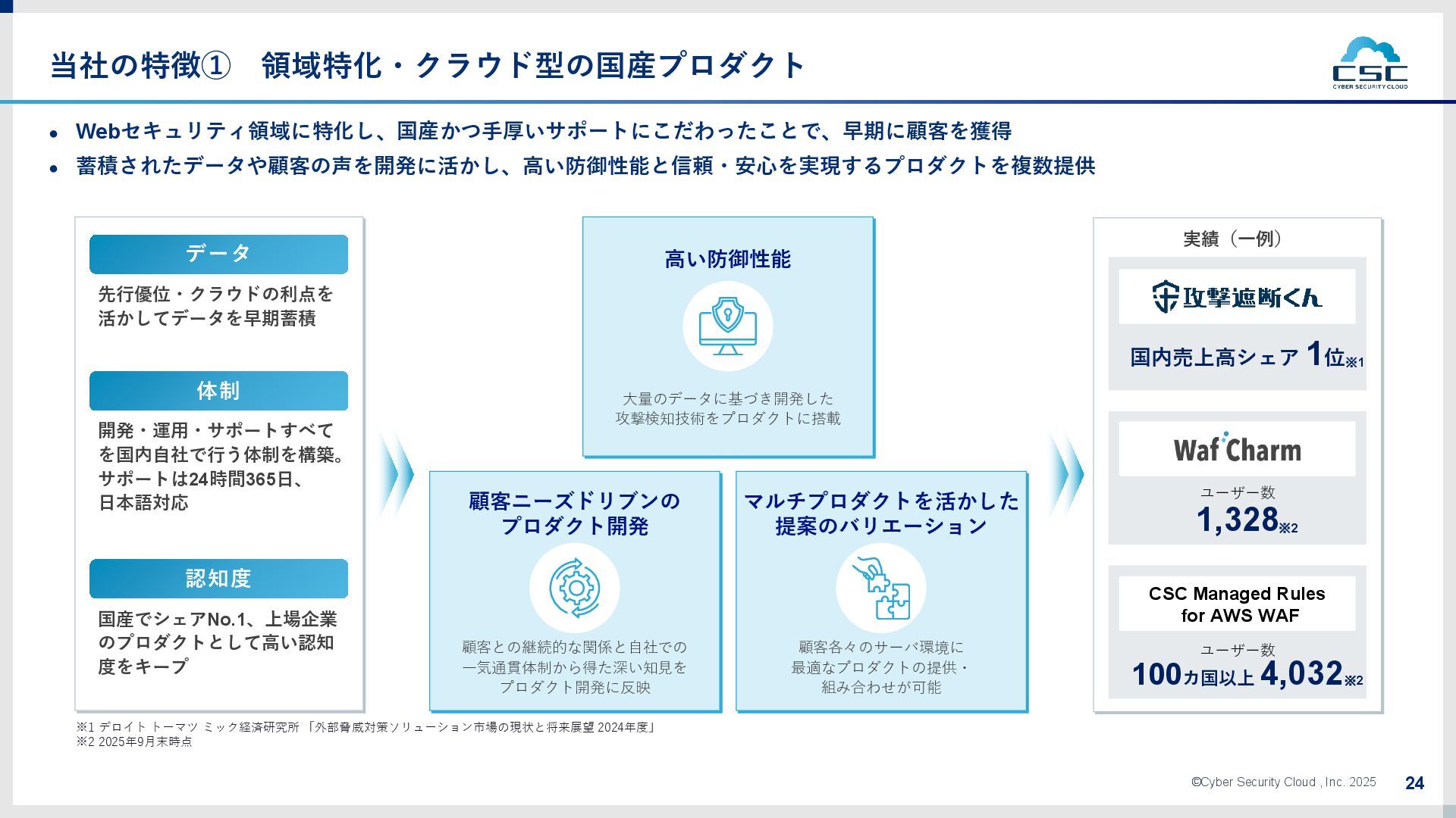 Webセキュリティ領域に特化し、国産かつ手厚いサポートにこだわったことで、早期に顧客を獲得 • 蓄積されたデータや顧客の声を開発に活かし、高い防御性能と信頼・安心を実現するプロダクトを複数提供 ※1 デロイト トーマツ ミック経済研究所 「外部脅威対策ソリューション市場の現状と将来展望 2024年度」 ※2 2025年9月末時点 国内売上高シェア 1位 CSC Managed Rules for AWS WAF 100カ国以上 4,032 ユーザー数 1,328 ユーザー数 実績(一例) 先行優位・クラウドの利点を 活かしてデータを早期蓄積 データ 開発・運用・サポートすべて を国内自社で行う体制を構築。 サポートは24時間365日、 日本語対応 体制 国産でシェアNo.1、上場企業 のプロダクトとして高い認知 度をキープ 認知度 大量のデータに基づき開発した 攻撃検知技術をプロダクトに搭載 高い防御性能 顧客との継続的な関係と自社での 一気通貫体制から得た深い知見を プロダクト開発に反映 顧客ニーズドリブンの プロダクト開発 顧客各々のサーバ環境に 最適なプロダクトの提供・ 組み合わせが可能 マルチプロダクトを活かした 提案のバリエーション ※1 ※2 ※2